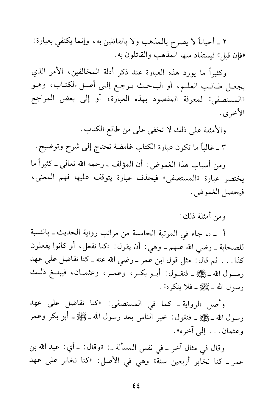 ومن أسباب هذا الغموض: أن المؤلف -رحمه الله تعالى- كثيرًا ما يختصر عبارة "المستصفى" فيحذف عبارة يتوقف عليها فهم المعنى، فيحصل الغموض.
