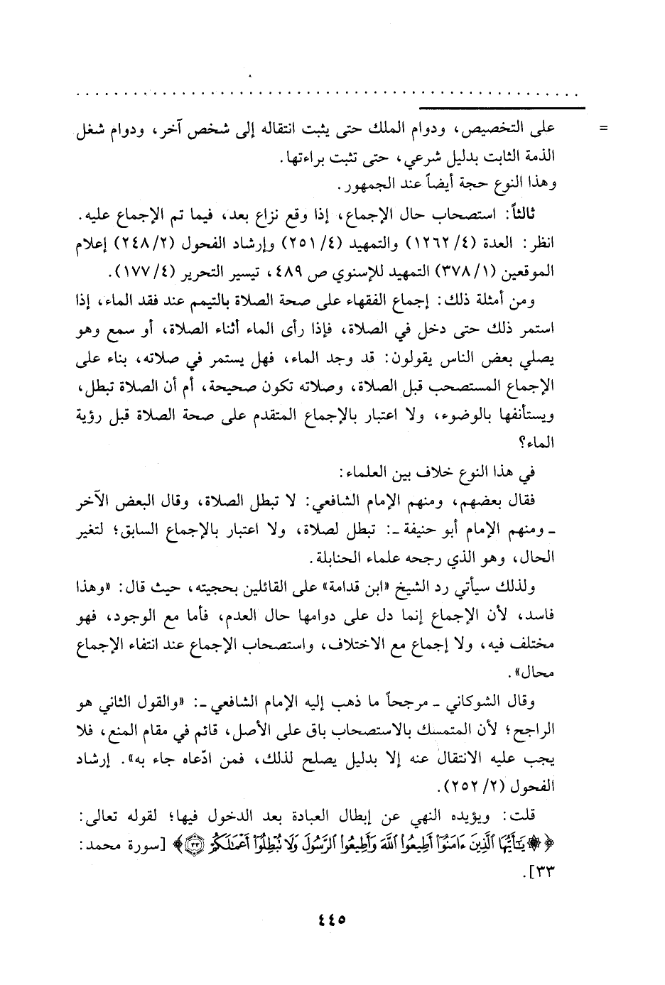 ولذلك سيأتي رد الشيخ "ابن قدامة" على القائلين بحجيته، حيث قال: "وهذا فاسد، لأن الإجماع إنما دل على دوامها حال العدم، فأما مع الوجود، فهو مختلف فيه، ولا إجماع مع الاختلاف، واستصحاب الإجماع عند انتفاء الإجماع محال".