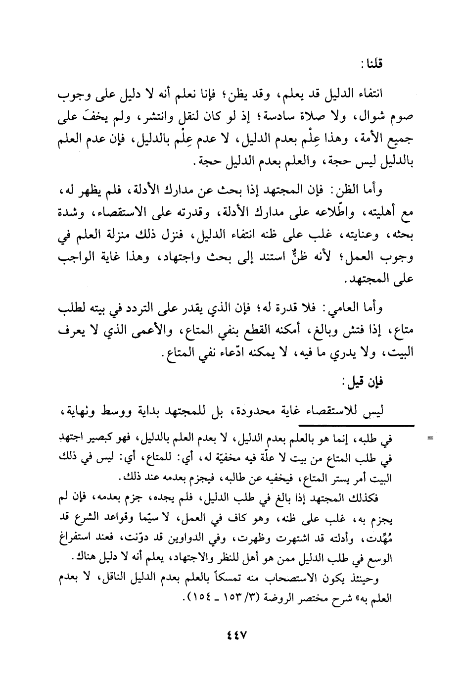 وحينئذ يكون الاستصحاب منه تمسكًا بالعلم بعدم الدليل الناقل، لا بعدم العلم به" شرح مختصر الروضة "3/ 153-154".