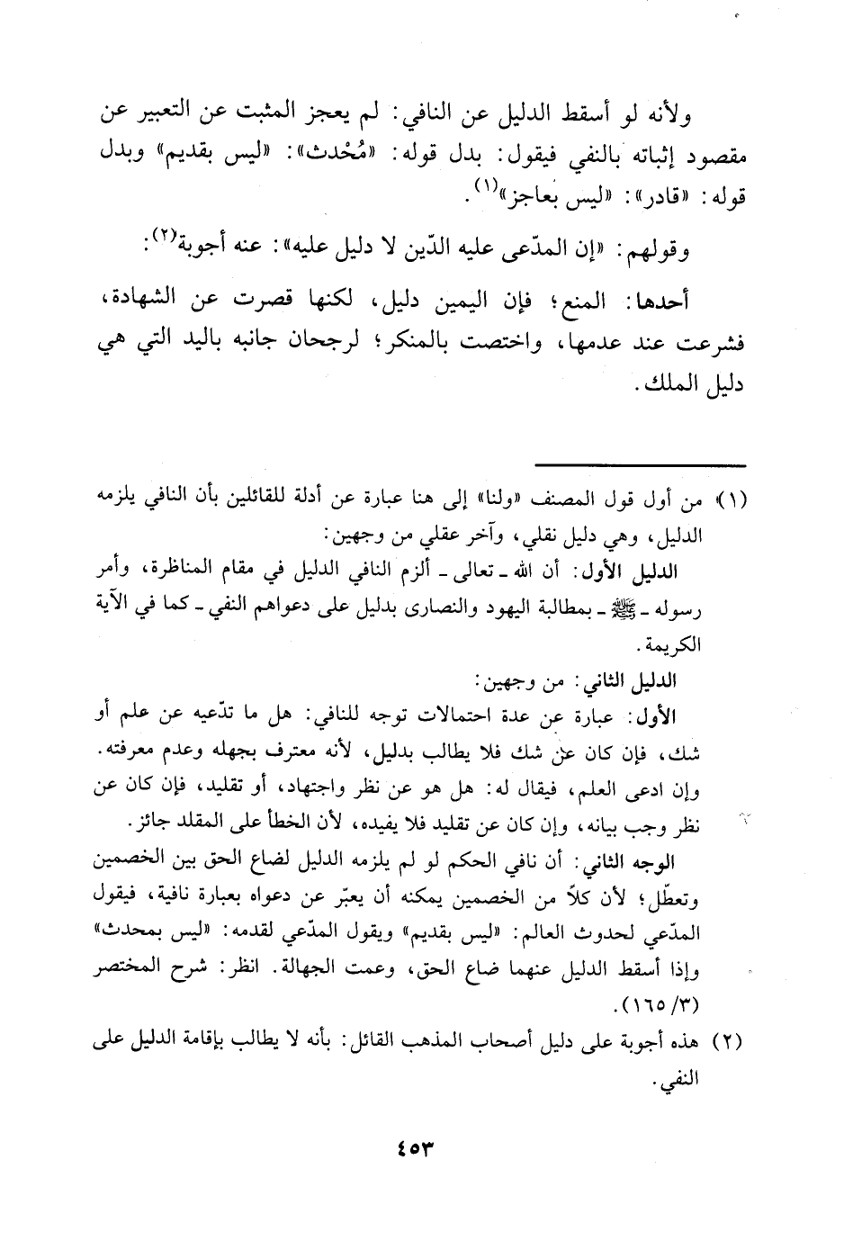 ولأنه لو أسقط الدليل عن النافي: لم يعجز المثبت عن التعبير عن مقصود إثباته بالنفي فيقول: بدل قوله: "مُحدَث": "ليس بقديم" وبدل قوله: "قادر": "ليس بعاجز"1.