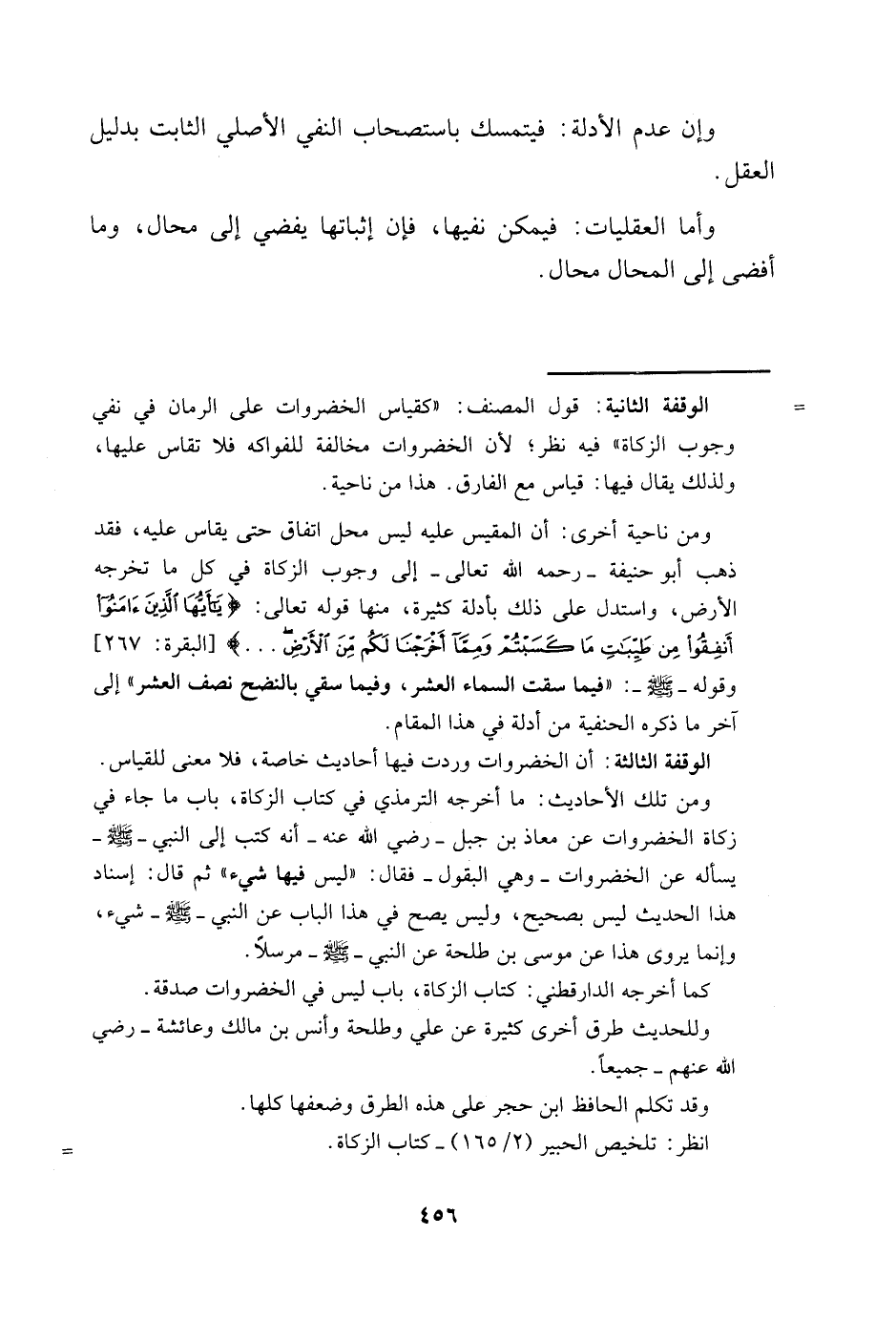 = الوقفة الثانية: قول المصنف: "كقياس الخضروات على الرمان في نفي وجوب الزكاة" فيه نظر؛ لأن الخضروات مخالفة للفواكه فلا تقاس عليها، ولذلك يقال فيها: قياس مع الفارق. هذا من ناحية.