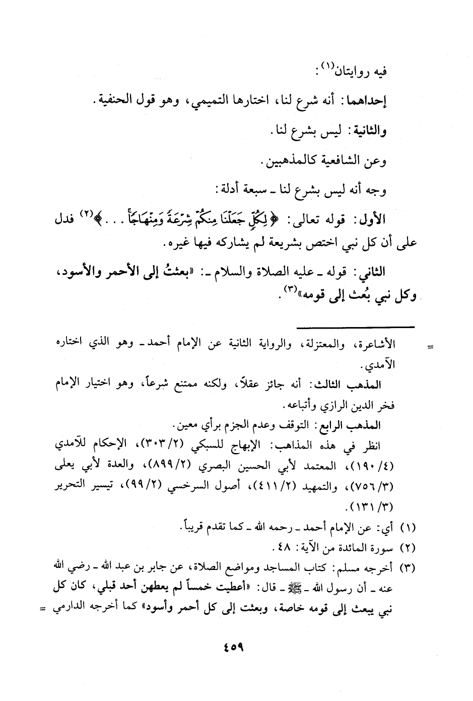الأول: قوله تعالى: لكل {لِكُلٍّ جَعَلْنَا مِنْكُمْ شِرْعَةً وَمِنْهَاجًا} 2 فدل على أن كل نبي اختص بشريعة لم يشاركه فيها غيره.