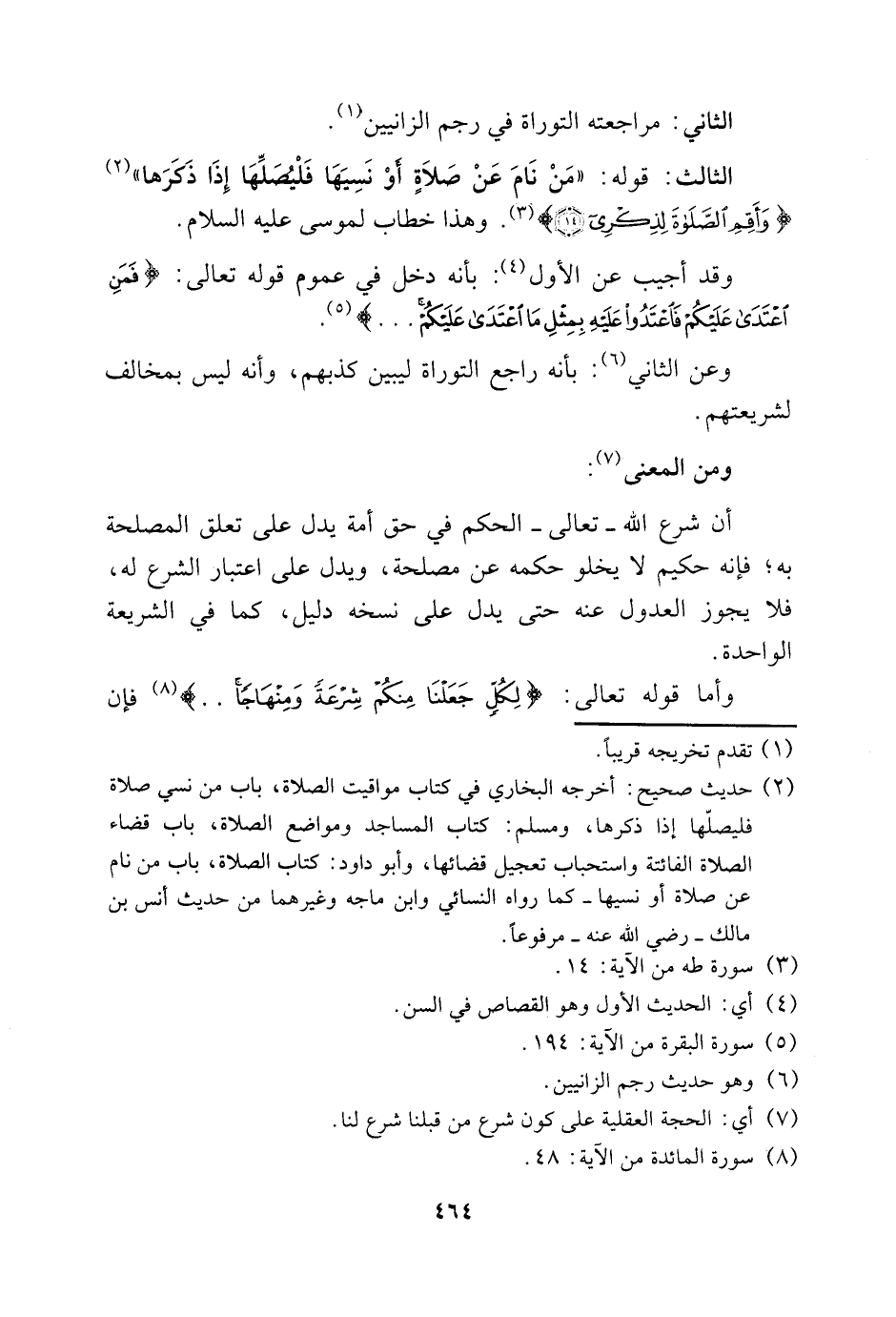 الثالث: قوله: "من نام عن الصلاة أو نسيها فليصلها إذا ذكرها"2 {وَأَقِمِ الصَّلاةَ لِذِكْرِي} 3. وهذا خطاب لموسى عليه السلام.