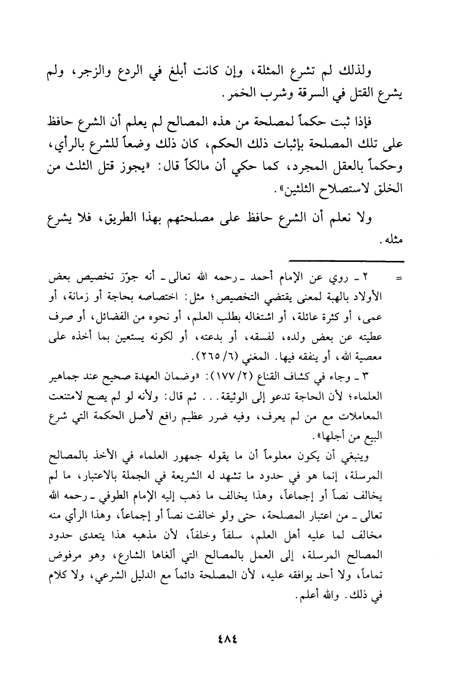 وينبغي أن يكون معلومًا أن ما يقوله جمهور العلماء في الأخذ بالمصالح المرسلة، إنما هو حدود ما تشهد له الشريعة في الجملة بالاعتبار، ما لم يخالف نصًّا أو إجماعًا، وهذا يخالف ما ذهب إليه الإمام الطوفي -رحمه الله تعالى- من اعتبار المصلحة، حتى ولو خالفت نصًّا أو إجماعًا، وهذا الرأي منه مخالف لما عليه أهل العلم، سلفًا وخلفًا، لأن مذهبه هذا يتعدى حدود المصالح المرسلة، إلى العمل بالمصالح التي ألغاها الشارع، وهو مرفوض تمامًا، ولا أحد يوافقه عليه، لأن المصلحة دائمًا مع الدليل الشرعي، ولا كلام في ذلك. والله أعلم.