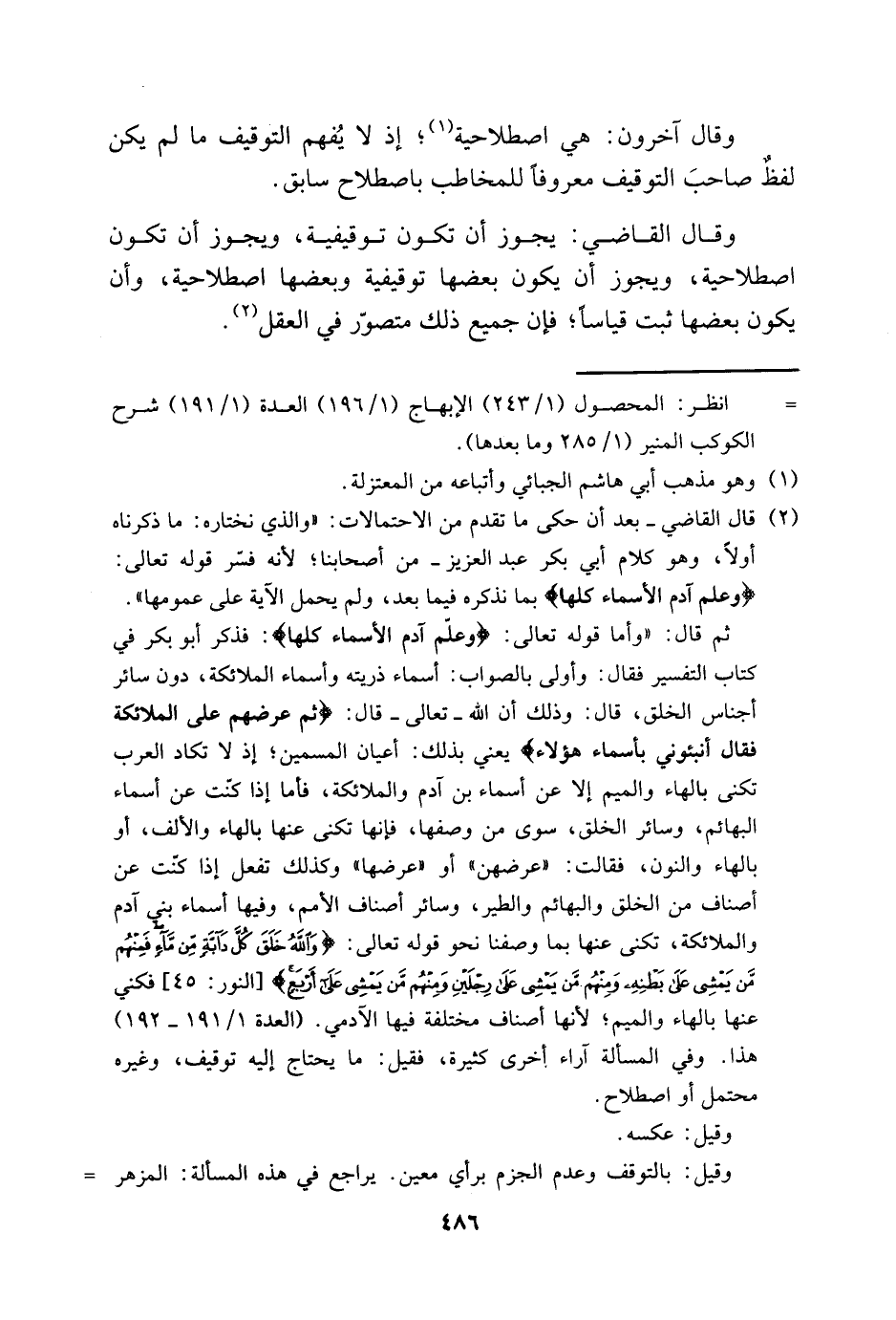 ثم قال: "وأما قوله تعالى: {وَعَلَّمَ آدَمَ الْأَسْمَاءَ كُلَّهَا} : فذكر أبو بكر في كتاب التفسير فقال: وأولى بالصواب: أسماء ذريته وأسماء الملائكة، دون سائر أجناس الخلق، قال: وذلك أن الله -تعالى- قال: {ثُمَّ عَرَضَهُمْ عَلَى الْمَلائِكَةِ فَقَالَ أَنْبِئُونِي بِأَسْمَاءِ هَؤُلاءِ} يعني بذلك: أعيان المسمين؛ إذ لا تكاد العرب تكني بالهاء والميم إلا عن أسماء بني آدم والملائكة، فأما إذا كنّت عن أسماء البهائم، وسائر الخلق، سوى من وصفها، فإنها تكني عنها بالهاء والألف، أو بالهاء والنون، فقالت: "عرضهن" أو "عرضها" وكذلك تفعل إذا كنّت عن أصناف من الخلق والبهائم والطير، وسائر أصناف الأمم، وفيها أسماء بني آدم والملائكة، تكني عنها بما وصفنا نحو قوله تعالى: {وَاللَّهُ خَلَقَ كُلَّ دَابَّةٍ مِنْ مَاءٍ فَمِنْهُمْ مَنْ يَمْشِي عَلَى بَطْنِهِ وَمِنْهُمْ مَنْ يَمْشِي عَلَى رِجْلَيْنِ وَمِنْهُمْ مَنْ يَمْشِي عَلَى أَرْبَعٍ} [النور: 45] فكني عنها بالهاء والميم؛ لأنها أصناف مختلفة فيها الآدمي. "العدة 1/ 191-192" هذا، وفي المسألة آراء أخرى كثيرة فقيل: ما يحتاج إليه توقيف، وغيره محتمل أو اصطلاح.