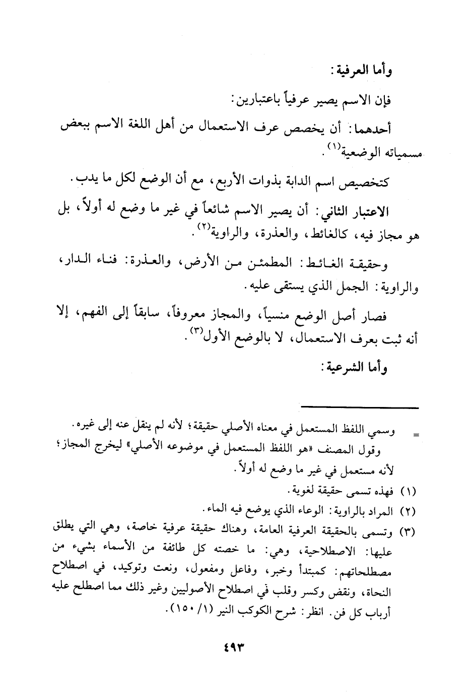 3 وتسمى بالحقيقة العرفية العامة، وهناك حقيقة عرفية، وهي التي يطلق عليها: الاصطلاحية، وهي: ما خصته كل طائفة من الأسماء بشيء من مصطلحاتهم: كمبتدأ وخبر، وفاعل ومفعول، ونعت وتوكيد، في اصطلاح النحاة ونقض وكسر وقلب في اصطلاح الأصوليين وغير ذلك مما اصطلح عليه أرباب كل فن. انظر: شرح الكوكب المنير "1/ 150".