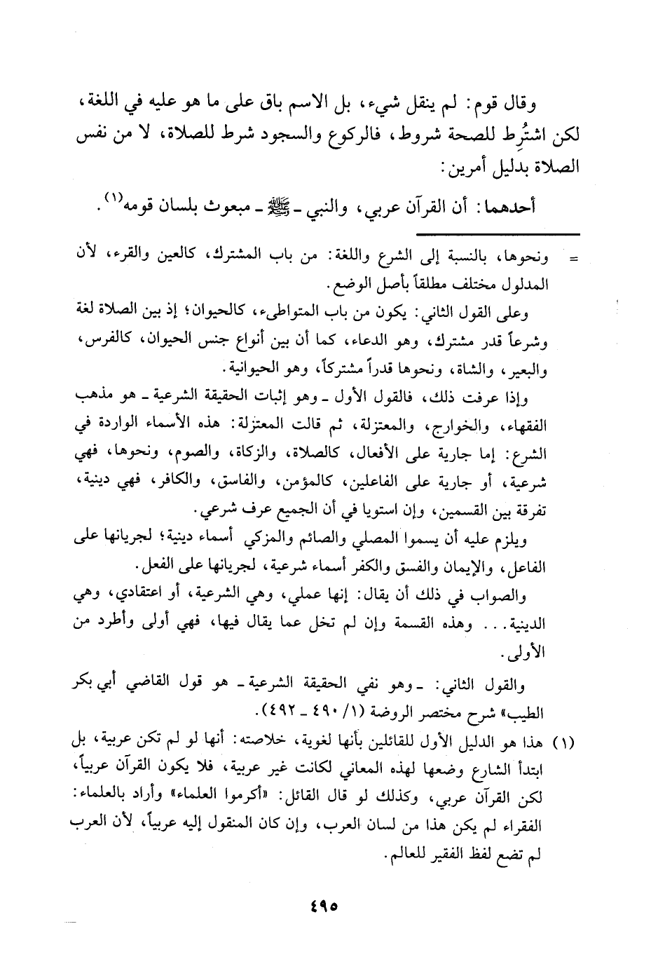 والقول الثاني: -وهو نفي الحقيقة الشرعية- هو قول القاضي أبي بكر الطيب" شرح مختصر الروضة "1/ 490-492".