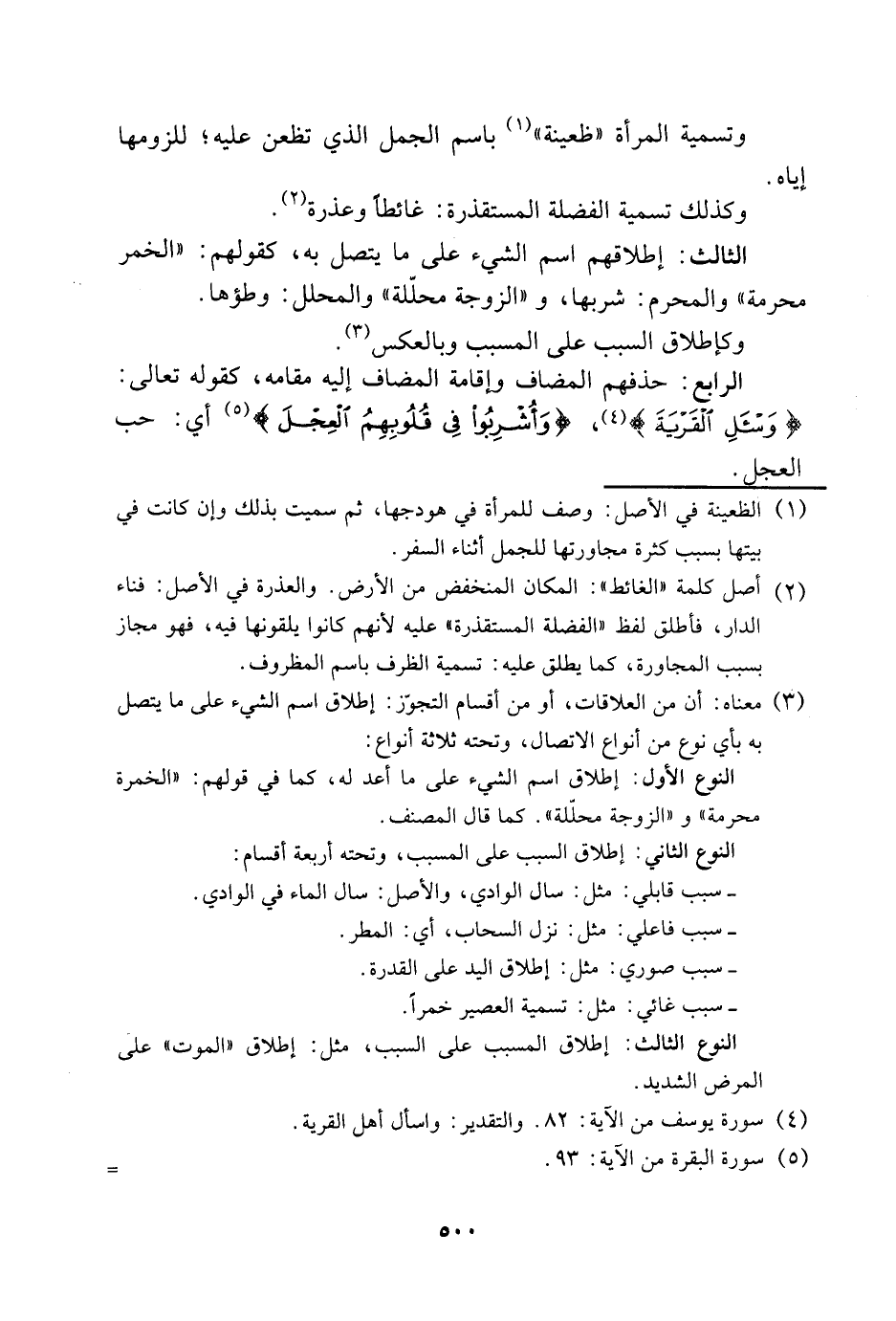 الثالث: إطلاقهم اسم الشيء على ما يتصل به، كقولهم "الخمر محرمة" والمحرم: شربها، "والزوجة محلّلة" والمحلل: وطؤها.