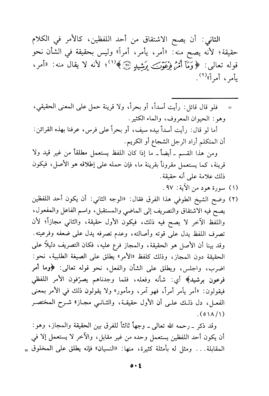 الثاني: أن يصح الاشتقاق من أحد اللفظين، كالأمر في الكلام حقيقة، لأنه يصح منه: "أمر، يأمر، أمرًا" وليس بحقيقة في الشأن نحو قوله تعالى: {وَمَا أَمْرُ فِرْعَوْنَ بِرَشِيدٍ} 1؛ لأنه لا يقال منه: "أمر، يأمر، أمرًا"2.