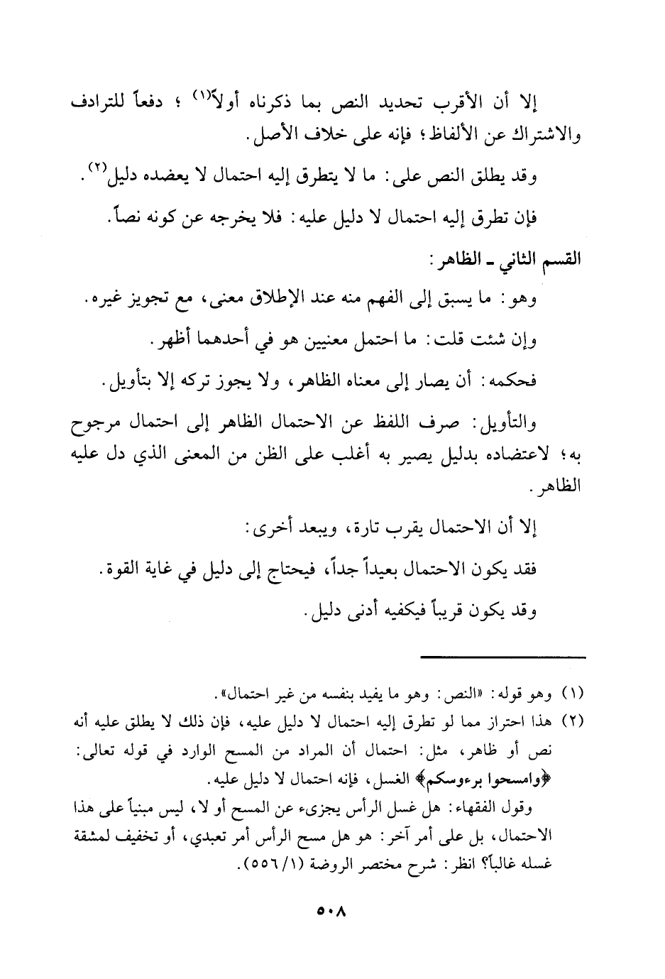 إلا أن الأقرب تحديد النص بما ذكرناه أولًا1؛ دفعًا للترادف والاشتراك عن الألفاظ، فإنه على خلاف الأصل.