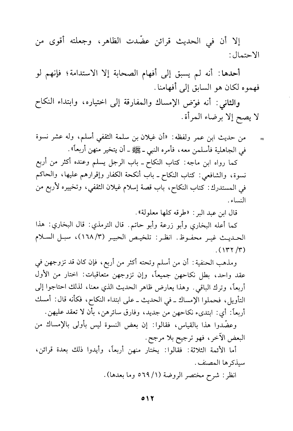 ومذهب الحنفية: أن من أسلم وتحته أكثر من أربع، فإن كان قد تزوجهن في عقد واحد، بطل نكاحهن جميعًا، وإن تزوجهن متعاقبات: اختار من الأول أربعًا، وترك الباقي، وهذا يعارض ظاهر الحديث الذي معنا، لذلك احتاجوا إلى التأويل، فحملوا الإمساك -في الحديث- على ابتداء النكاح، فكأنه قال: أمسك أربعًا: أي: ابتدئ نكاحهن من جديد، وفارق سائرهن، بأن لا تعقد عليهن.