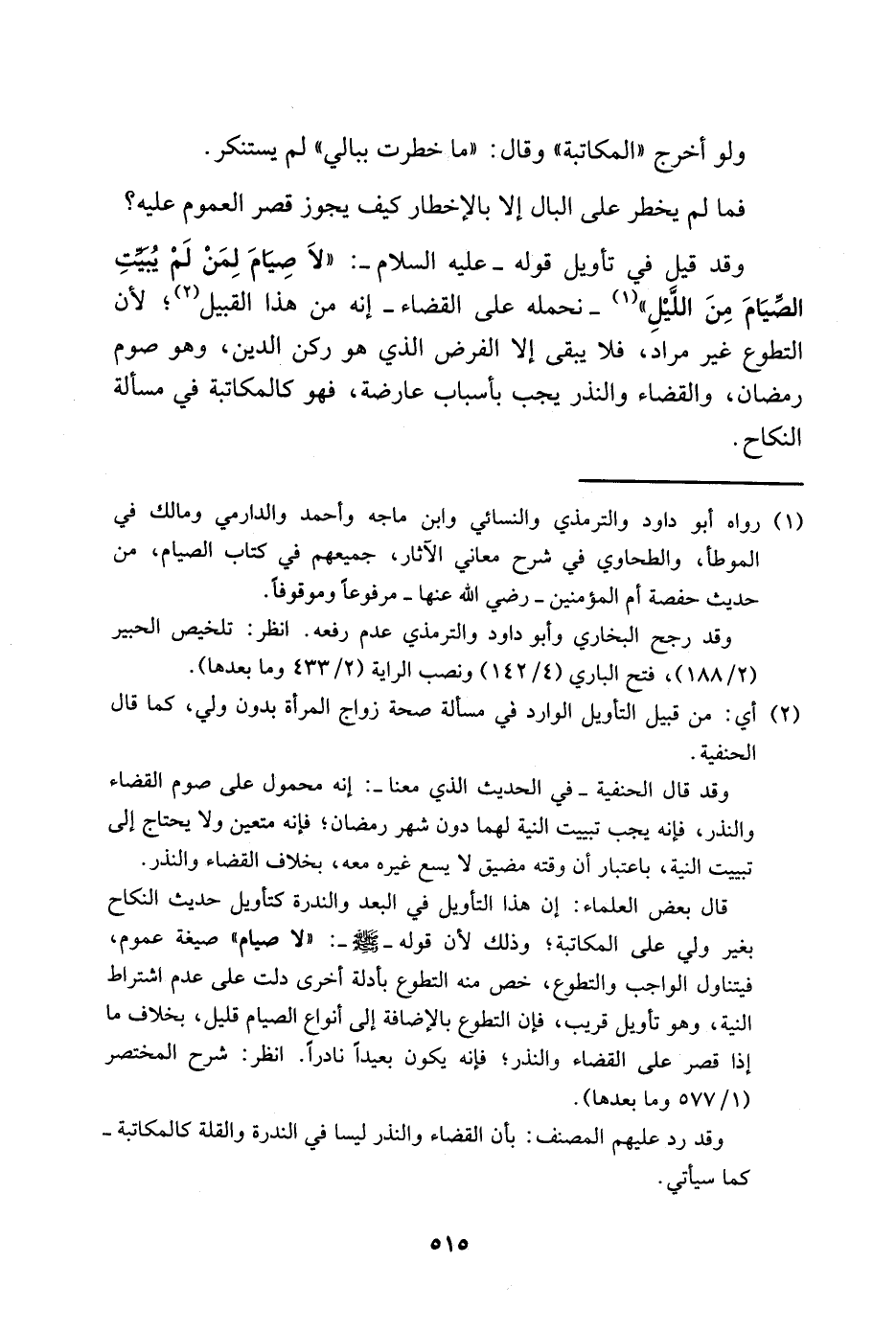 وقد قيل في تأويل قوله -عليه السلام-: "لا صيام لمن لم يبيت الصيام بالليل" 1 -يحمله على القضاء- إنه من هذا القبيل2؛ لأن التطوع غير مراد، فلا يبقى إلا الغرض الذي هو ركن الدين، وهو صوم رمضان، والقضاء والنذر يجب بأسباب عارضة، فهو كالمكاتبة في مسألة النكاح.