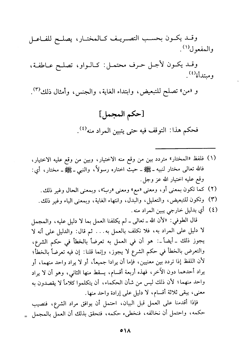 قال الطوفي: "لأن الله -تعالى- لم يكلفنا العمل بما لا دليل عليه، والمجمل لا دليل على المراد به، لا نكلف بالعمل به ... ثم قال: والدليل على أنه لا يجوز ذلك -أيضًا-: هو أن في العمل به تعرضًا بالخطأ في حكم الشرع، والتعرض بالخطأ في حكم الشرع لا يجوز، وإنما قلنا: إن فيه تعرضًا بالخطأ؛ لأن اللفظ إذا تردد بين معنيين، فإما أن يرادا جميعًا، أو لا يراد واحد منهما، أو يراد أحدهما دون الآخر، فهذه أربعة أقسام، يسقط منها الثاني، وهو أن لا يراد واحد منهما؛ لأن ذلك ليس من شأن الحكماء، أن يتكلموا كلامًا لا يقصدون به معنى، يبقى ثلاثة أقسام، لا دليل على إرادة واحد منها.