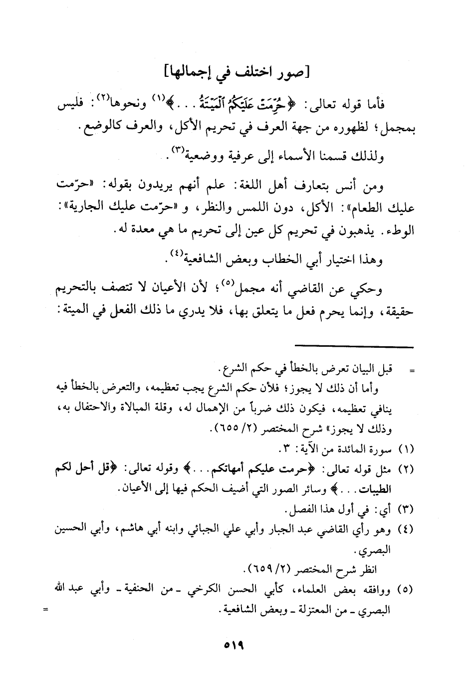 2 مثل قوله تعالى: {حُرِّمَتْ عَلَيْكُمْ أُمَّهَاتُكُمْ} وقوله تعالى: {قُلْ أُحِلَّ لَكُمُ الطَّيِّبَاتِ} وسائر الصور التي أضيف الحكم فيها إلى الأعيان.