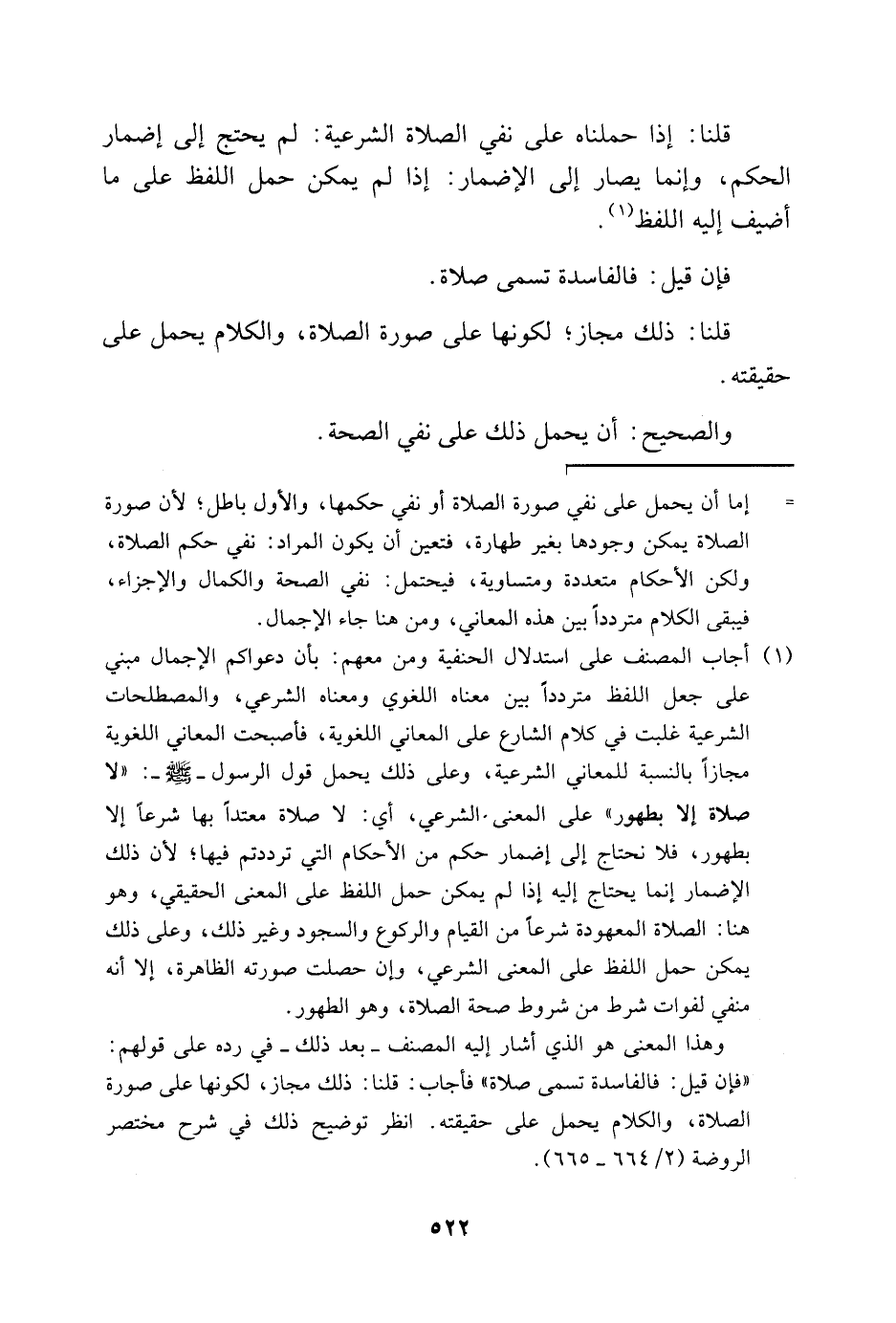 قلنا: إذا حملناه على نفي الصلاة الشرعية: لم يحتج إلى إضمار الحكم، وإنما يصار إلى الإضمار: إذا لم يمكن حمل اللفظ على ما أضيف إليه اللفظ1.