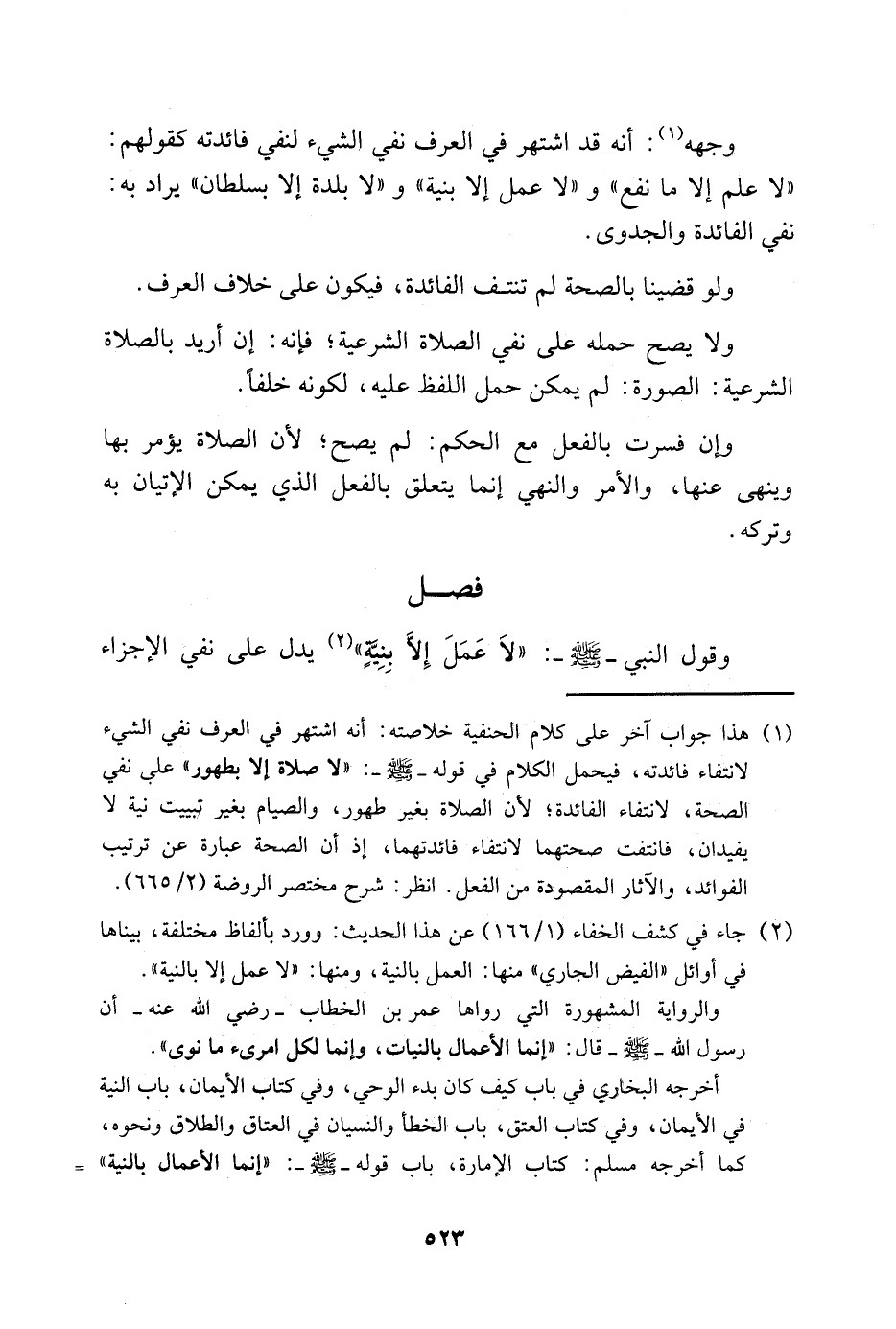 1 هذا جواب آخر على كلام الحنفية خلاصته: أنه اشتهر في العرف نفي الشيء لانتفاء فائدته، فيحمل الكلام في قوله -صلى الله عليه وسلم-: "لا صلاة إلا بطهور" على نفي الصحة، لانتفاء الفائدة؛ لأن الصلاة بغير طهور، والصيام بغير تبييت نية لا يفيدان، فانتفت صحتها لانتفاء فائدتهما، إذ إن الصحة عبارة عن ترتيب الفوائد، والآثار المقصودة من الفعل. انظر: شرح مختصر الروضة "2/ 665".