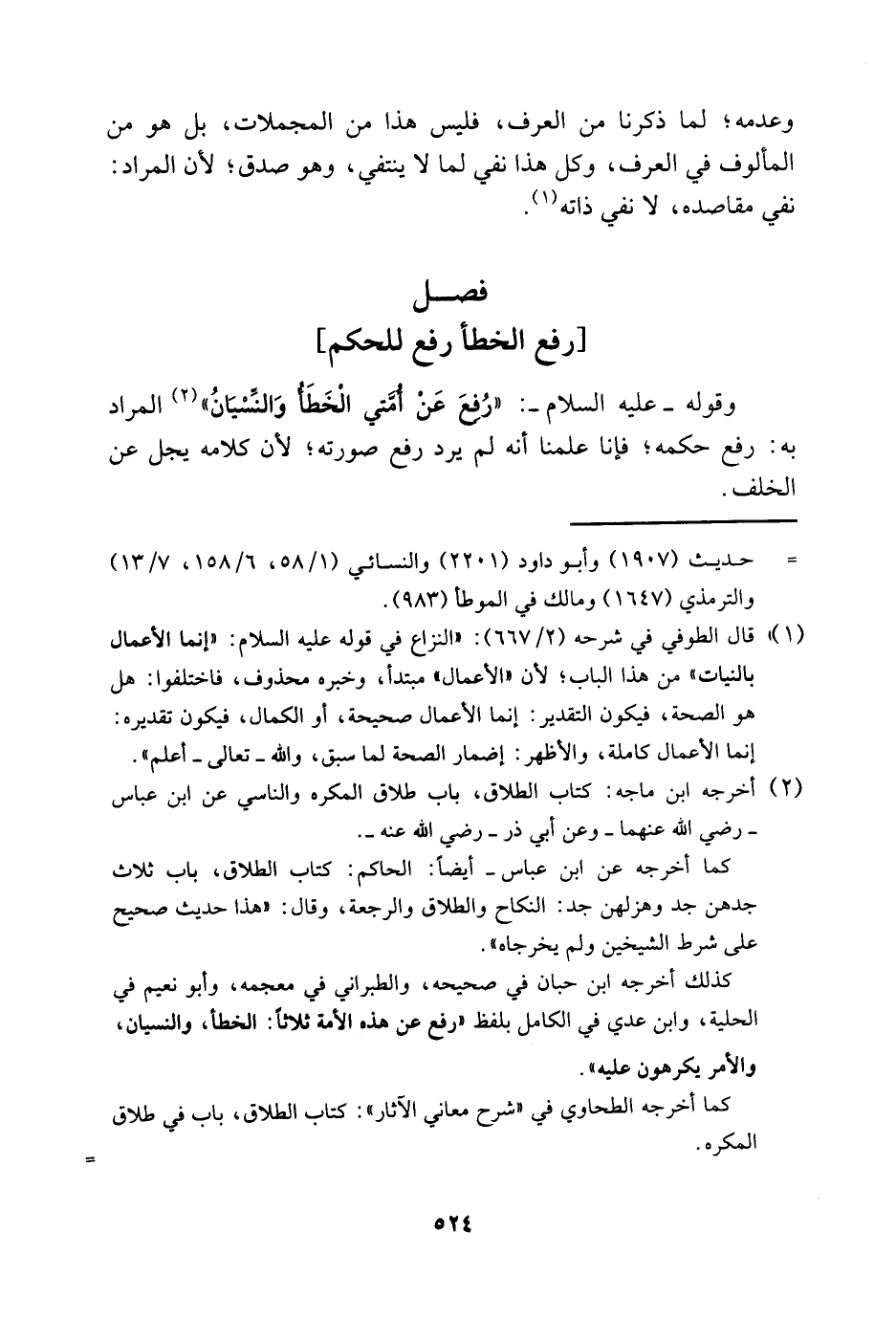 وقوله -عليه الصلاة والسلام-: "رفع عن أمتي الخطأ والنسيان" 1 المراد به رفع حكمه؛ فإنا علمنا أنه لم يرد رفع صورته؛ لأن كلامه يجل عن الخلف.