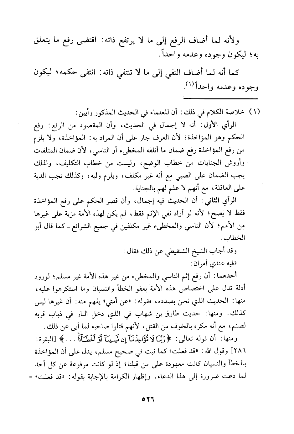 الرأي الأول: أنه لا إجمال في الحديث، وأن المقصود من الرفع: رفع الحكم وهو المؤاخذة؛ لأن العرف جارعلى أن المراد به: المؤاخذة، ولا يلزم من رفع المؤاخذة رفع ضمان ما أتلفه المخطئ أو الناسي، لأن ضمان المتلفات وأروش الجنايات من خطاب الوضع، وليست من خطاب التكليف، ولذلك يجب الضمان على الصبي مع أنه غير مكلف، ويلزم وليه، وكذلك تجب الدية على العاقلة، مع أنهم لا علم لهم بالجناية.