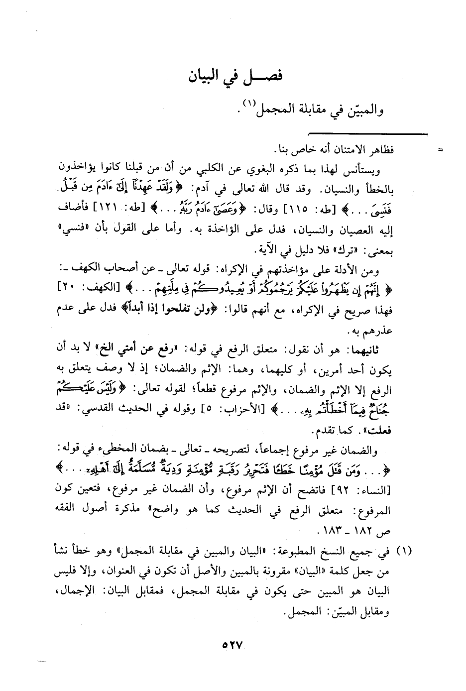 1 في جميع النسخ المطبوعة: "البيان والمبين في مقابلة المجمل" وهو خطأ نشأ من جعل كلمة "البيان" مقرونة بالمبين والأصل أن تكون في العنوان، وإلا فليس البيان هو المبين حتى يكون في مقابلة المجمل، فمقابل البيان: الإجمال، ومقابل المبين: المجمل.