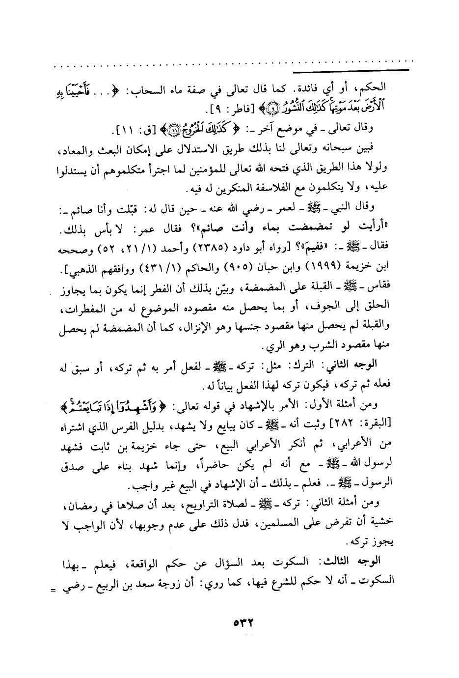 الوجه الثالث: السكوت بعد السؤال عن حكم الواقعة، فيعلم -بهذا السكوت- أنه لا حكم للشرع فيها، كما روي: أن زوجة سعد بن الربيع -رضي =