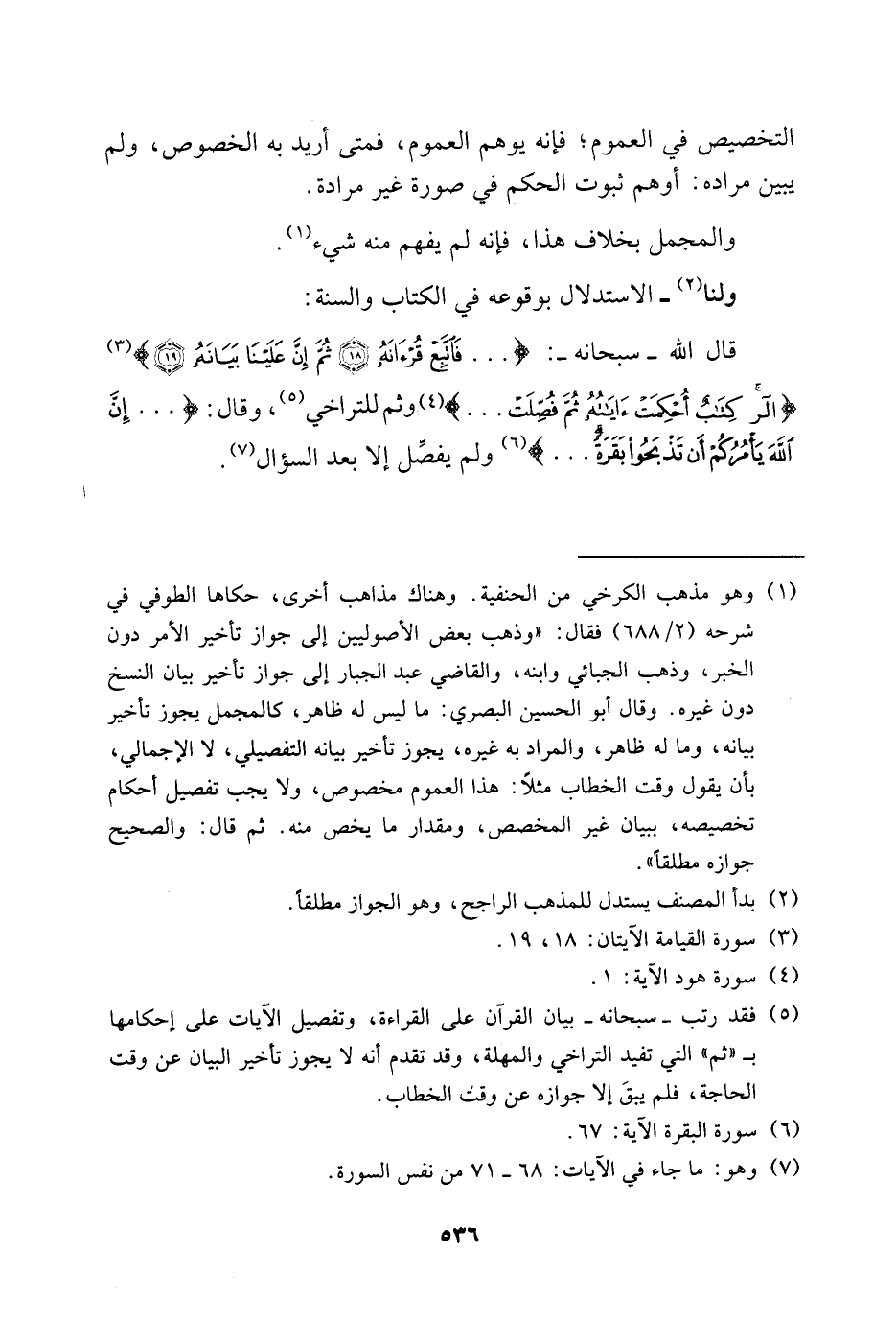 5 فقد رتب -سبحانه- بيان القرآن على القراءة، وتفصيل الآيات على إحكامها بـ"ثم" التي تفيد التراخي والمهلة، وقد تقدم أنه لا يجوز تأخير البيان عن وقت الحاجة، فلم يبق إلا جوازه عن وقت الخطاب.
