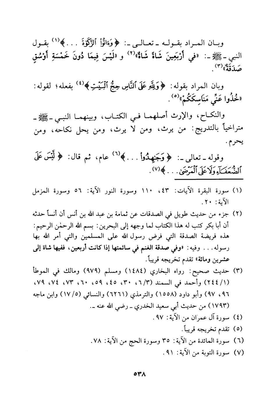 وبان المراد بقوله -تعالى-: {وَآتُوا الزَّكَاةَ} 1 بقول النبي -صلى الله عليه وسلم-: "في أربعين شاة شاة" 2 و "ليس فيما دون خمسة أوسق صدقة" 3.