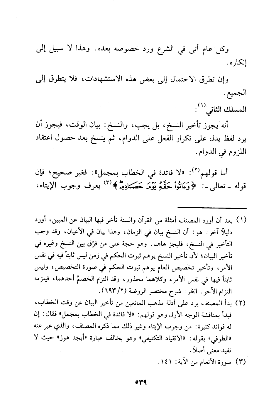 2 بدأ المصنف يرد على أدلة مذهب المانعين من تأخير البيان عن وقت الخطاب، فبدأ بمناقشة الوجه الأول وهو قولهم: "لا فائدة في الخطاب بمجمل" فقال: إن له فوائد كثيرة: من وجوب الإيتاء وغير ذلك مما ذكره المصنف، والذي عبر عنه "الطوفي" بقوله: "الانقياد التكليفي" وهو يخالف عبارة "أبجد هوز" حيث لا تفيد معنى أصلًا.