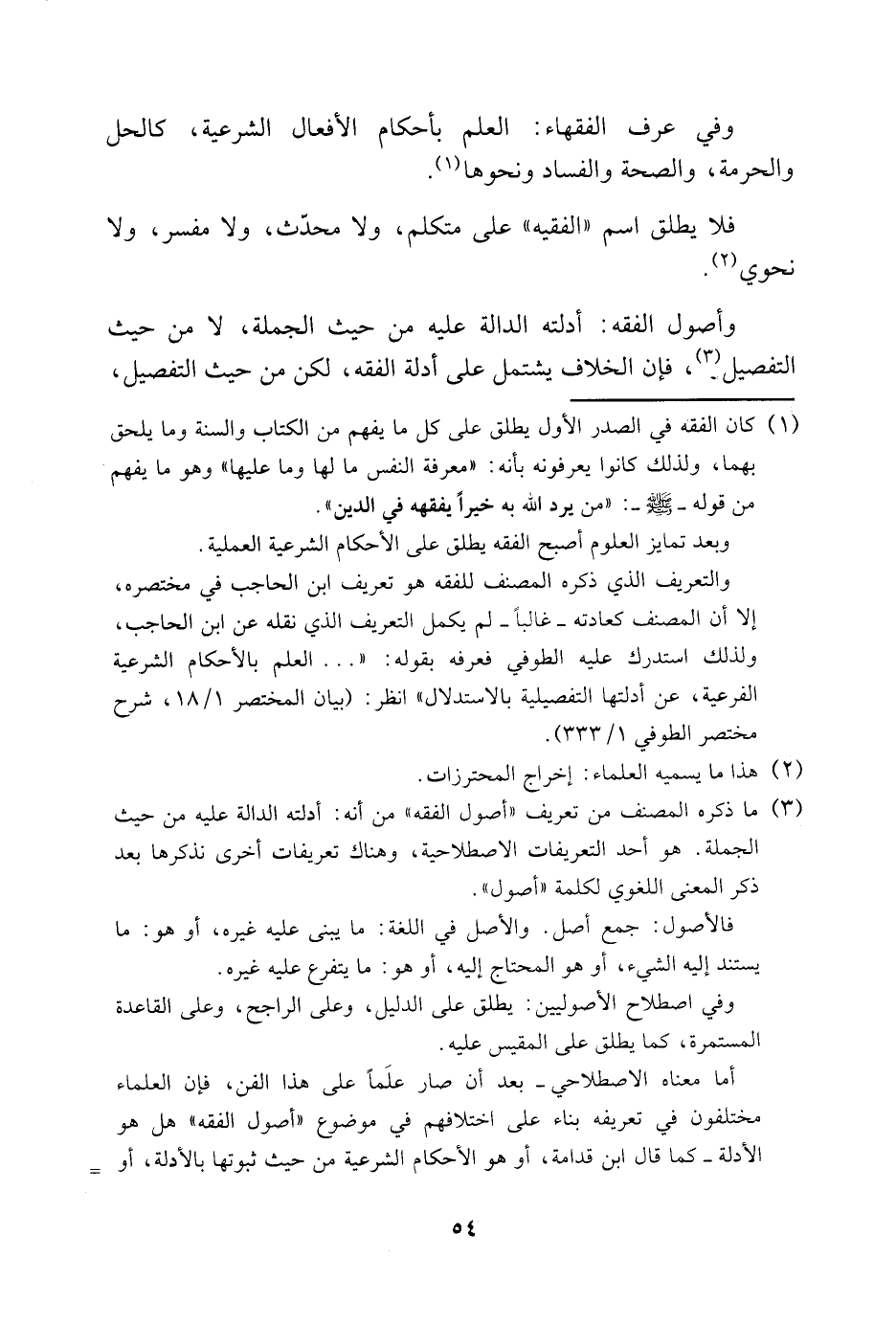 والتعريف الذي ذكره المصنف للفقه هو تعريف ابن الحاجب في مختصره، إلا أن المصنف كعادته -غالبًا- لم يكمل التعريف الذي نقله عن ابن الحاجب، ولذلك استدرك عليه الطوفي فعرفه بقوله: ".... العلم بالأحكام الشرعية، الفرعية، عن أدلتها التفصيلية بالاستدلال" انظر: "بيان المختصر 1/ 18، شرح مختصر الطوفي 1/ 333".