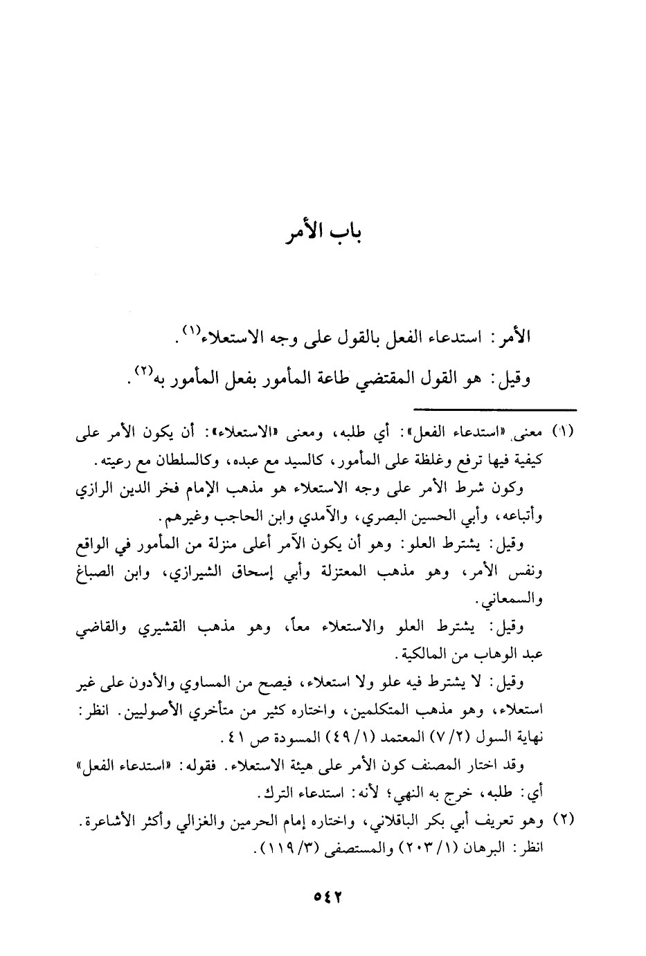 1 معنى "استدعاء الفعل": أي طلبه، ومعنى "الاستعلاء": أن يكون الأمر على كيفية فيها ترفع وغلظة على المأمور، كالسيد مع عبده، وكالسلطان مع رعيته.