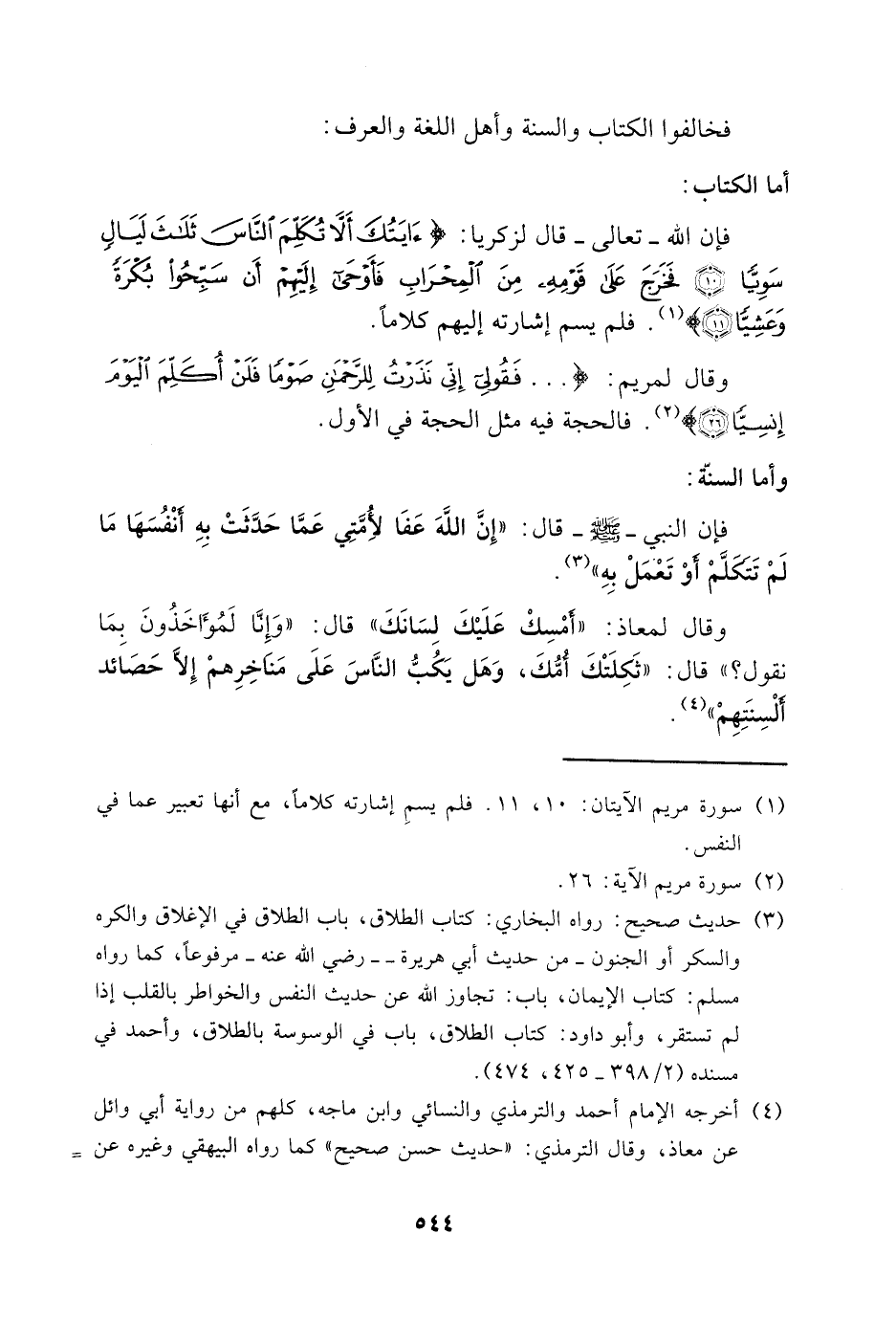 وقال لمريم: {فَقُولِي إِنِّي نَذَرْتُ لِلرَّحْمَنِ صَوْمًا فَلَنْ أُكَلِّمَ الْيَوْمَ إِنْسِيًّا} 2. فالحجة فيه مثل الحجة في الأول.