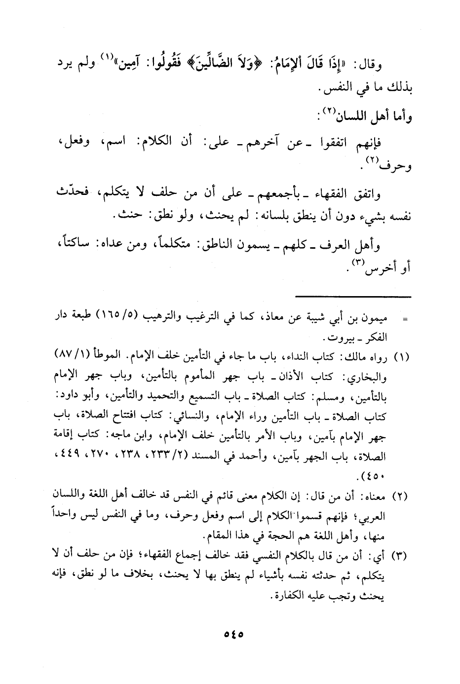 3 أي: أن من قال بالكلام النفسي فقد خالف إجماع الفقهاء، فإن من حلف أن لا يتكلم، ثم حدثته نفسه بأشياء لم ينطق بها لا يحنث، بخلاف ما لو نطق، فإنه يحنث وتجب عليه الكفارة.