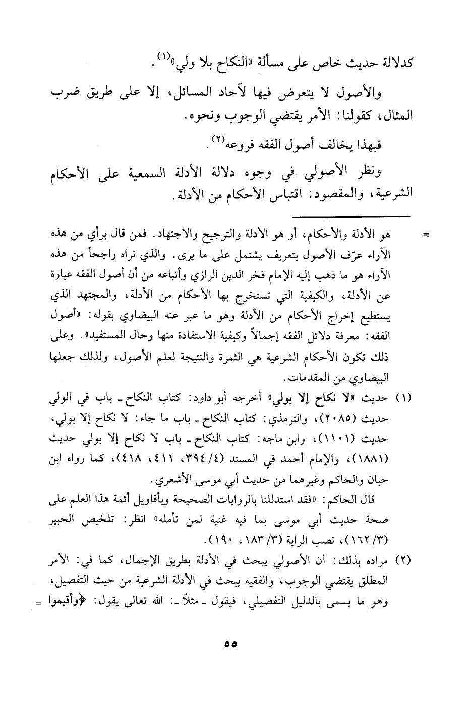 2 مراده بذلك: أن الأصولي يبحث في الأدلة بطريق الإجمال، كما في: الأمر المطلق يقتضي الوجوب، والفقيه يبحث في الأدلة الشرعية من حيث التفصيل، وهو ما يسمى بالدليل التفصيلي، فيقول -مثلا-: الله تعالى يقول: {وَأَقِيمُوا =