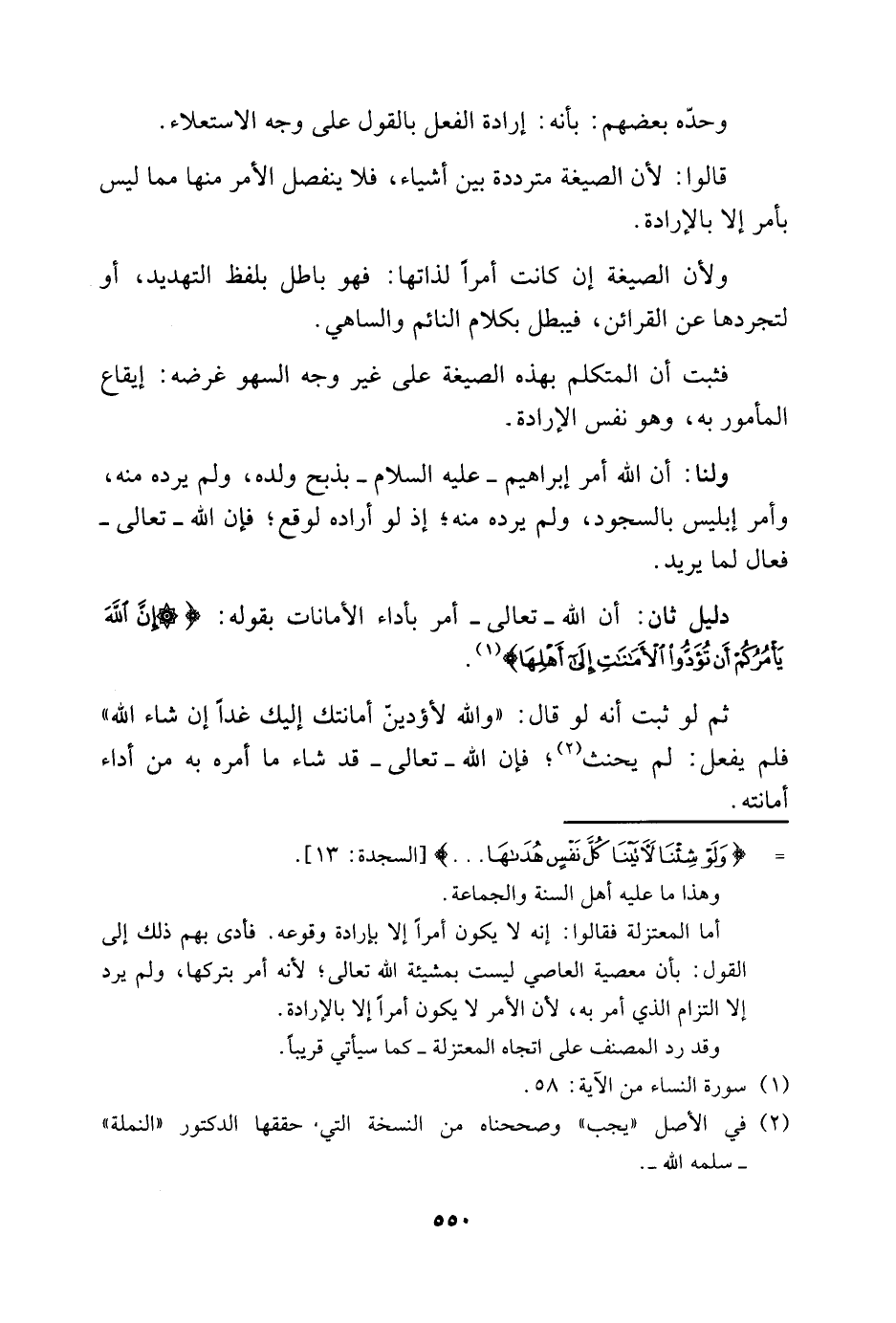فثبت أن المتكلم بهذه الصيغة على غير وجه السهو غرضه: المأمور به، وهو نفس الإرادة ولنا: أن الله أمر إبراهيم –عليه السلام- بذبح ولده، ولم يرده منه وأمر أبليس بالسجود، ولم يرده منه؛ إذ لو أراده لوقع؛ فإن الله -تعالى- فعال لما يريد.