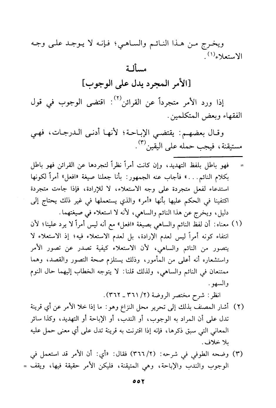 2 وضحه الطوفي في شرحه: "2/ 366 فقال: "أي: أن الأمر قد استعمل في الوجوب والندب والإباحة، وهي المتيقنة، فليكن الأمر حقيقة فيها، ويقف
