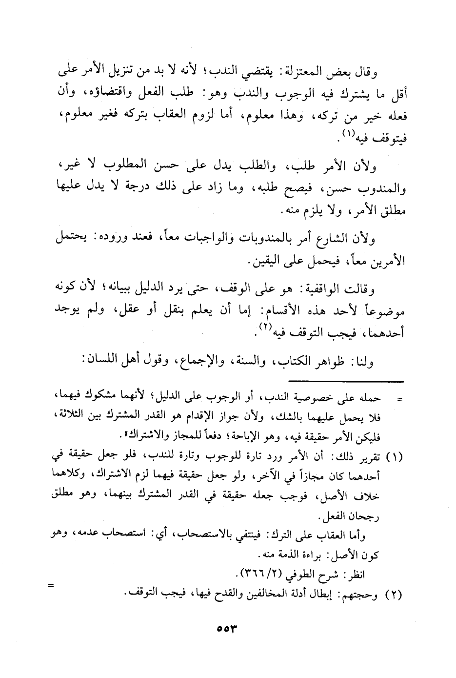 وقال بعض المعتزلة: يقتضي الندب؛ لأنه لا بد من تنزيل الأمر على أقل ما يشترك فيه الوجوب والندب وهو: طلب الفعل واقتضاؤه، وأن فعله خير من تركه، وهذا معلوم، أما لزوم العقاب بتركه فغير معلوم، فيتوقف فيه1.
