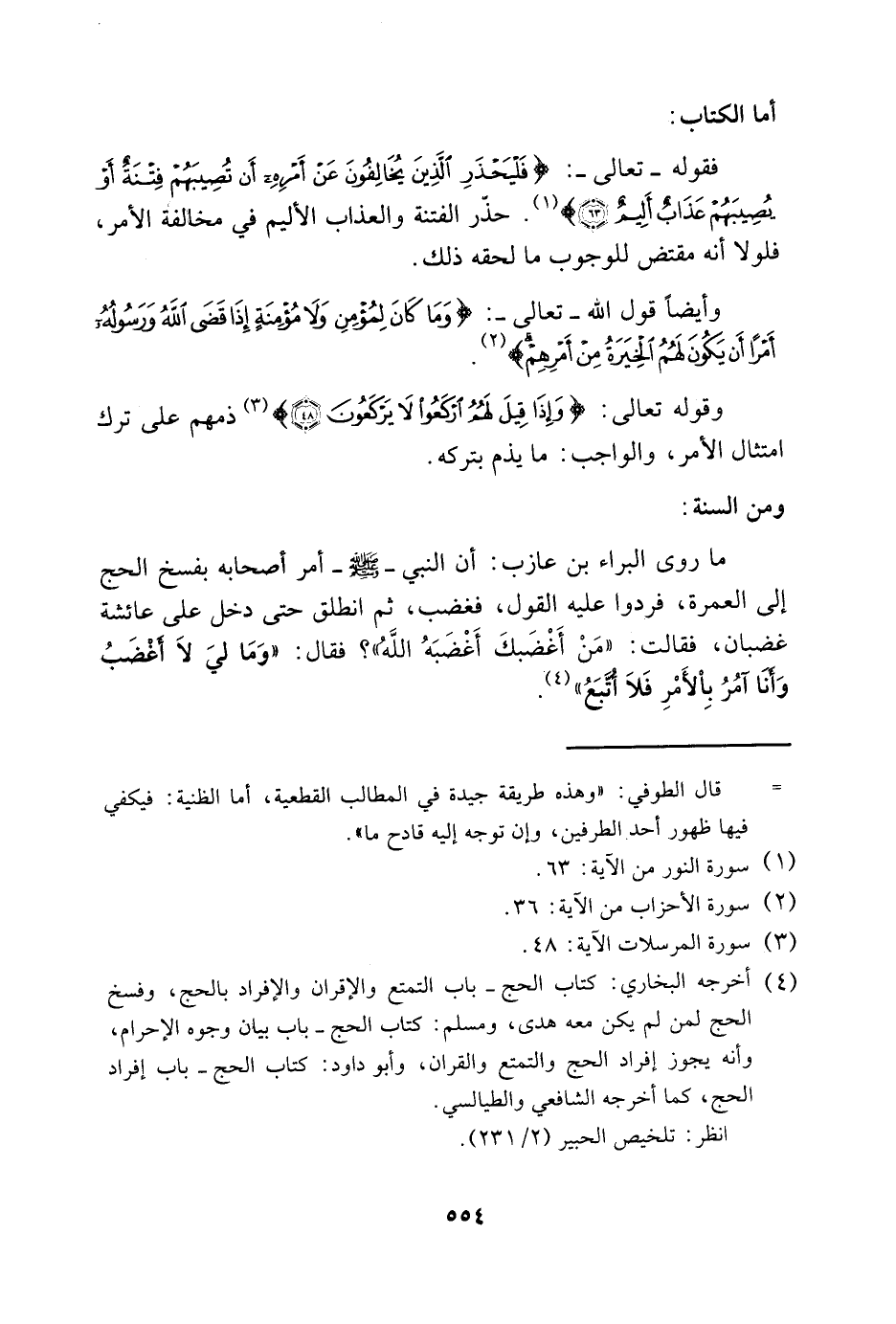 فقوله –تعالى-: {فَلْيَحْذَرِ الَّذِينَ يُخَالِفُونَ عَنْ أَمْرِهِ أَنْ تُصِيبَهُمْ فِتْنَةٌ أَوْ يُصِيبَهُمْ عَذَابٌ أَلِيمٌ} 1. حذر الفتنة والعذاب الأليم في مخالفة الأمر، فلولا أنه مقتض للوجوب ما لحقه ذلك.