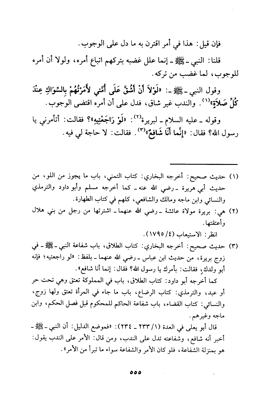 وقوله -عليه السلام- لبريرة2: "لو راجعتيه؟ " قالت: أتأمرني يا رسول الله؟ فقال: "إنما أنا شافع" 3. فقالت: لا حاجة لي فيه.