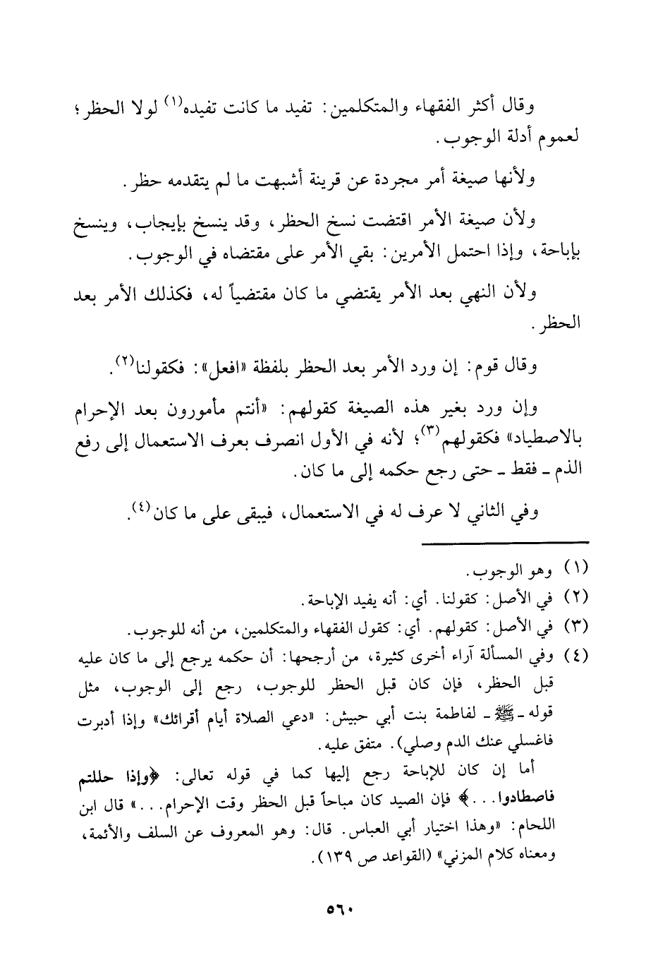 4 وفي المسألة آراء أخرى كثيرة، من أرجحها: أن حكمه يرجع إلى ما كان عليه قبل الحظر، فإن كان قبل الحظر للوجوب، رجع إلى الوجوب، مثل قوله -صلى الله عليه وسلم- لفاطمه بنت أبي حبيش: "دعي الصلاة أيام أقرائك، وإذا أدبرت فاغسلي عنك الدم وصلي". متفق عليه.