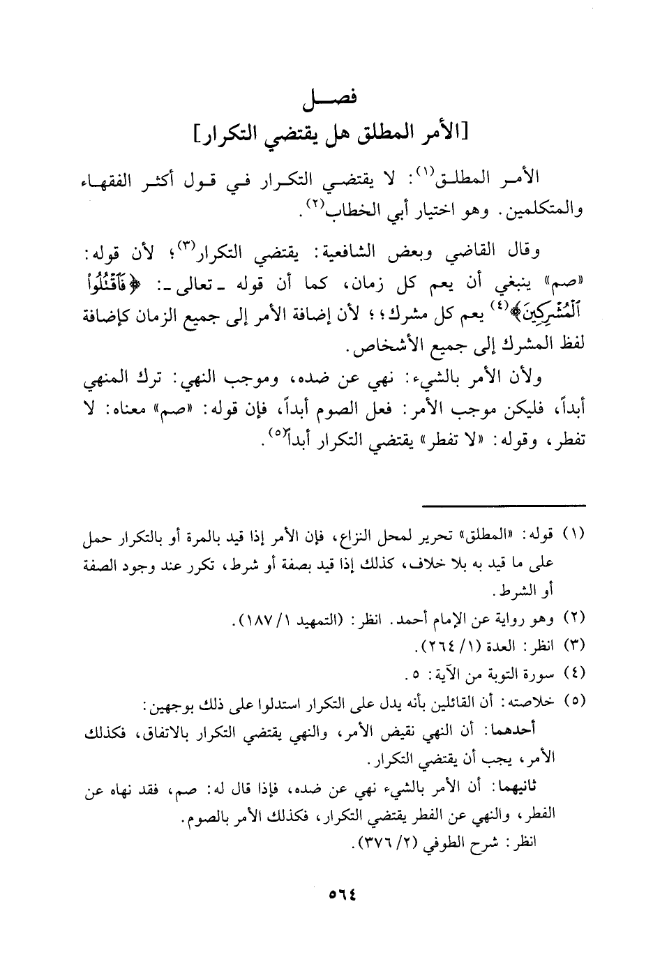 الأمر المطلق1: لا يقتضي التكرار في قول أكثر الفقهاء والمتكلمين. وهو اختيار أبي الخطاب2.