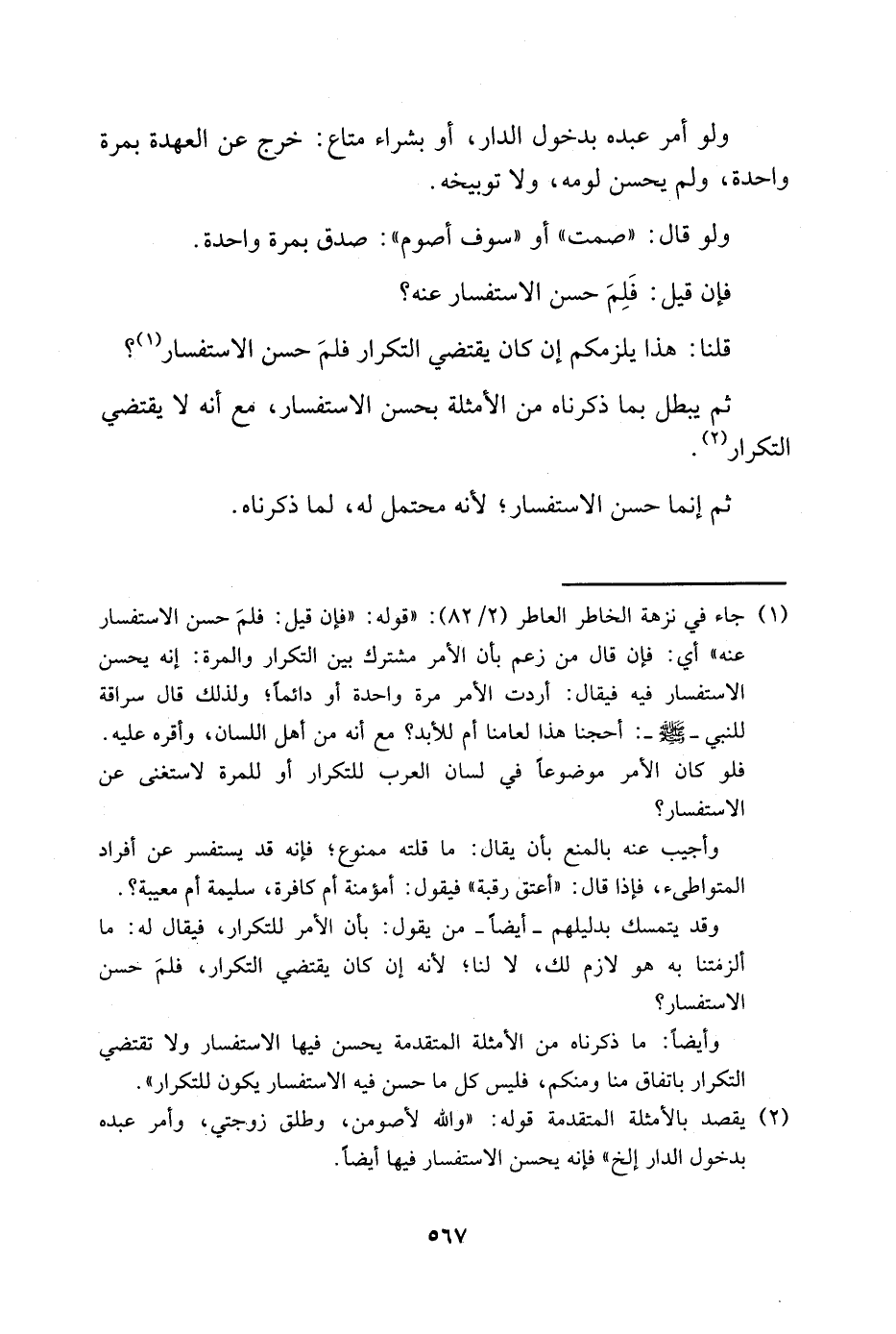 جاء في نزهة الخاطر العاطر "2/ 82": "قوله: "فإن قيل: فلم حسن الاستفسار عنه" أي: فإن قال من زعم بأن الأمر مشترك بين التكرار والمرة: إنه يحسن الاستفسار فيه فيقال: أردت الأمر مرة واحدة أو دائمًا؛ ولذلك قال سراقة للنبي -صلى الله عليه وسلم-: أحجنا هذا لعامنا أم للأبد؟ مع أنه من أهل اللسان، وأقره عليه. فلو كان الأمر موضوعًا في لسان العرب للتكرار أو للمرة لاستغنى عنه الاستفسار؟