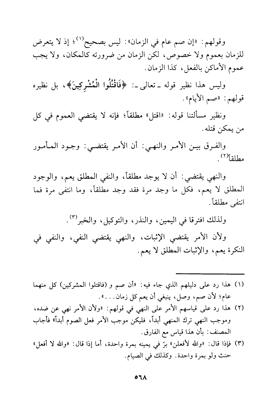 1 هذا رد على دليلهم الذي جاء فيه: "أن صم و"فاقتلوا المشركين" كل منهما عام؛ لأن صم، وصل، ينبغي أن يعم كل زمان....".