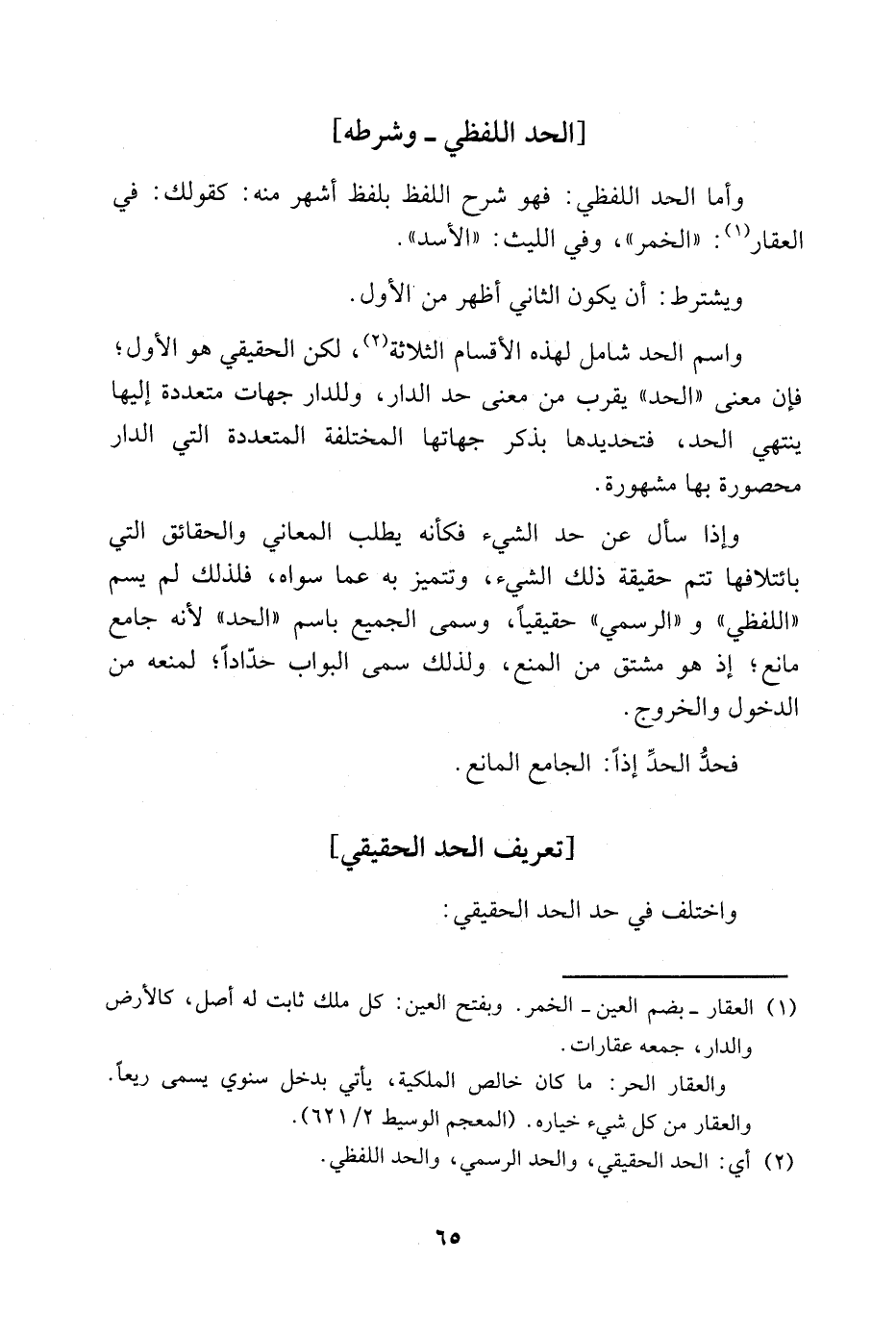 واسم الحد شامل لهذه الأقسام الثلاثة2، لكن الحقيقي هو الأول؛ فإن معنى "الحد" يقرب من معنى حد الدار، وللدار جهات متعددة إليها ينتهي الحد، فتحديدها بذكر جهاتها المختلفة المتعددة التي الدار محصورة بها مشهورة.