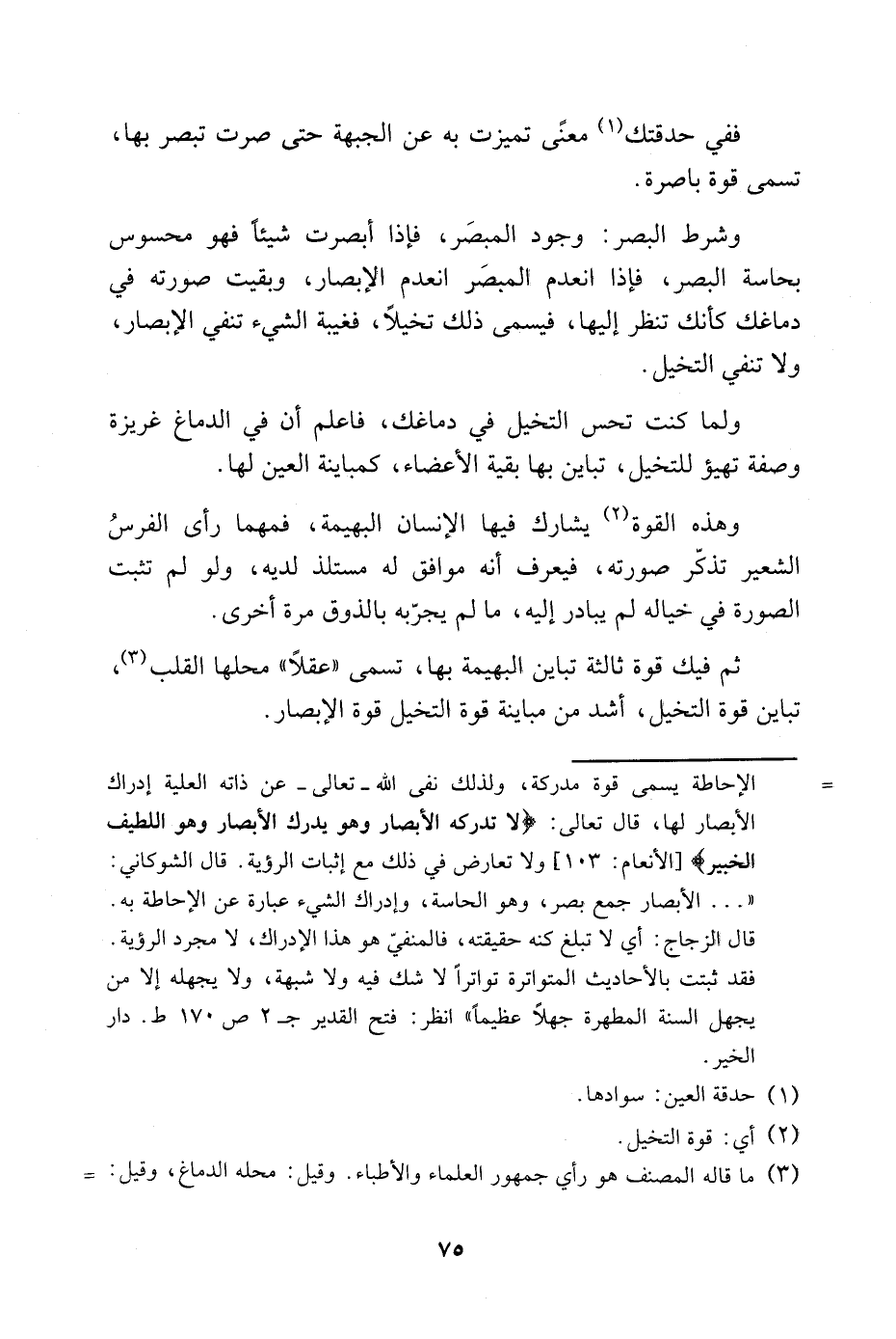 = الإحاطة يسمى قوة مدركة، ولذلك نفى الله -تعالى- عن ذاته العلية، إدراك الأبصار لها، قال تعالى: {لَا تُدْرِكُهُ الْأَبْصَارُ وَهُوَ يُدْرِكُ الْأَبْصَارَ وَهُوَ اللَّطِيفُ الْخَبِيرُ} [الأنعام: 103] ولا تعارض في ذلك مع إثبات الرؤية: قال الشوكاني: ".... الأبصار جمع بصر، وهو الحاسة، وإدراك الشيء عبارة عن الإحاطة به.