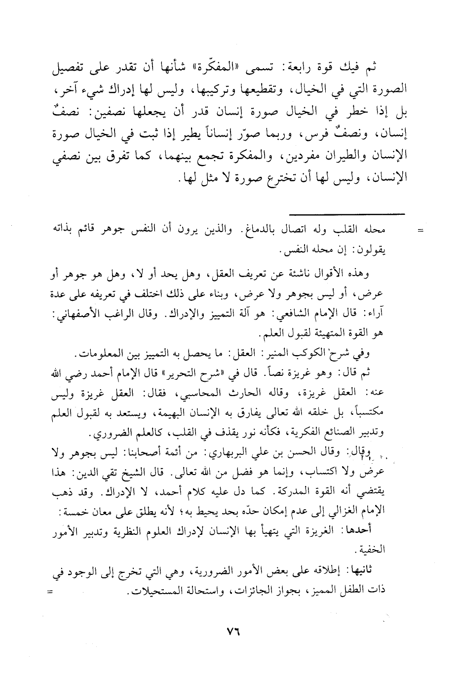 وقال: وقال الحسن بن علي البربهاري: من أئمة أصحابنا: ليس بجوهر ولا عرض ولا اكتساب، وإنما هو فضل من الله تعالى. قال الشيخ تقي الدين: هذا يقتضي أنه القوة المدركة. كما دل عليه كلام أحمد، لا الإدراك. وقد ذهب الإمام الغزالي إلى عدم إمكان حدّه بحد يحيط به؛ لأنه يطلق على معان خمسة: