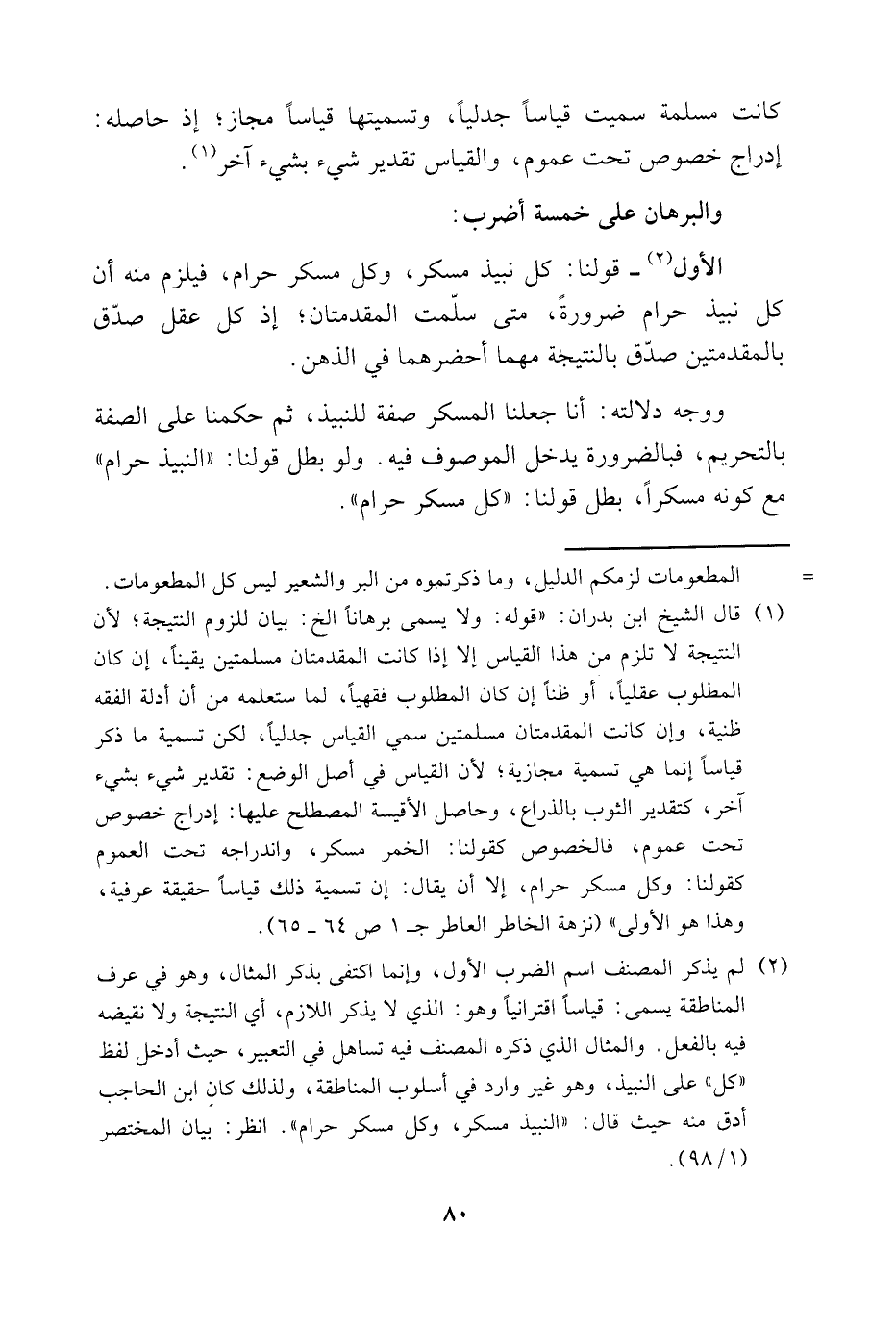 1 قال الشيخ ابن بدران: "قوله: ولا يسمى برهانًا الخ: بيان للزوم النتيجة؛ لأن النتيجة لا تلزم من هذا القياس إلا إذا كانت المقدمتان مسلمتين يقينًا، إن كان المطلوب عقليًّا، أو ظنًّا إن كان المطلوب فقهيًا، لما ستعلمه من أن أدلة الفقه ظنية، وإن كانت المقدمتان مسلمتين سمي القياس جدليًّا، لكن تسمية ما ذكر قياسًا إنما هي تسمية مجازية؛ لأن القياس في أصل الوضع: تقدير شيء بشيء آخر، كتقدير الثوب بالذراع، وحاصل الأقيسة المصطلح عليها: إدراج خصوص تحت عموم، فالخصوص كقولنا: الخمر مسكر، واندراجه تحت العموم كقولنا: وكل مسكر حرام، إلا أن يقال: إن تسمية ذلك قياسًا حقيقة عرفية، وهذا هو الأولى: "نزهة الخاطر العاطر جـ1 ص64-65".