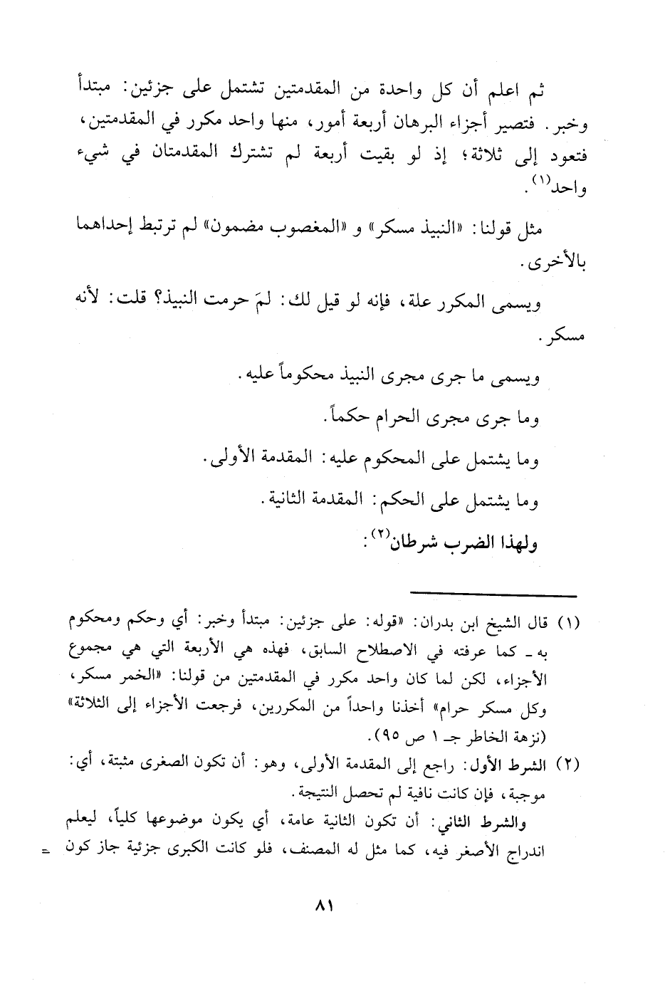 1 قال الشيخ ابن بدران: "قوله: على جزئين: مبتدأ وخبر: أي وحكم ومحكوم به -كما عرفته في الاصطلاح السابق-، فهذه هي الأربعة التي هي مجموع الأجزاء، لكن لما كان واحد مكرر في المقدمتين من قولنا: "الخمر مسكر، وكل مسكر حرام" أخذنا واحدًا من المكررين، فرجعت الأجزاء إلى الثلاثة" "نزهة الخاطر جـ1 ص95".