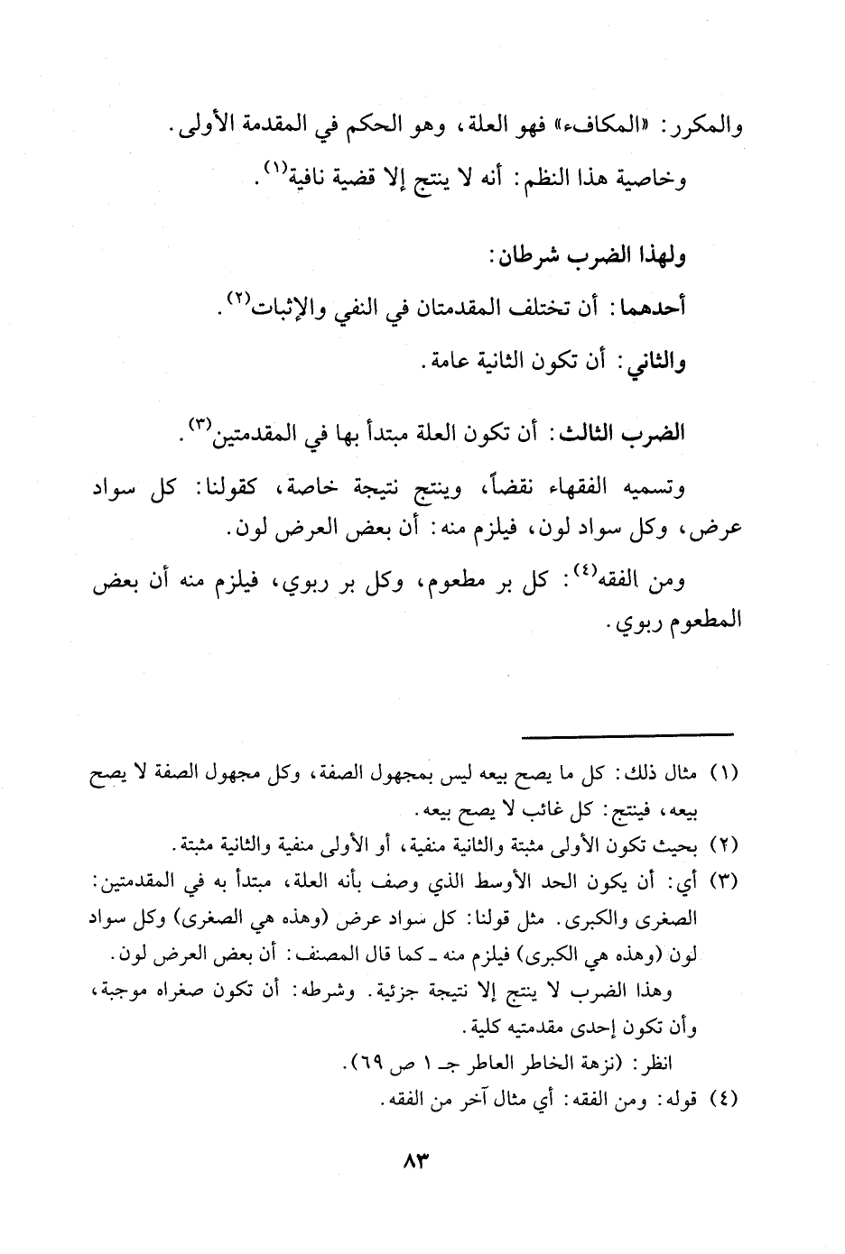 1 مثال ذلك: كل ما يصح بيعه ليس بمجهول الصفة، وكل مجهول الصفة لا يصح بيعه، فينتج: كل غائب لا يصح بيعه.