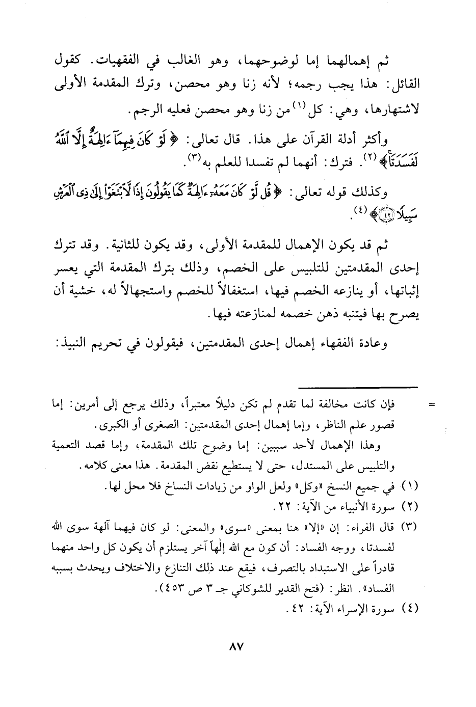 ثم إهمالهما إما لوضوحهما، وهو الغالب في الفقهيات. كقول القائل: هذا يجب رجمه؛ لأنه زنا وهو محصن، وترك المقدمة الأولى لاشتهارها، وهي: كل1 من زنا وهو محصن فعليه الرجم.