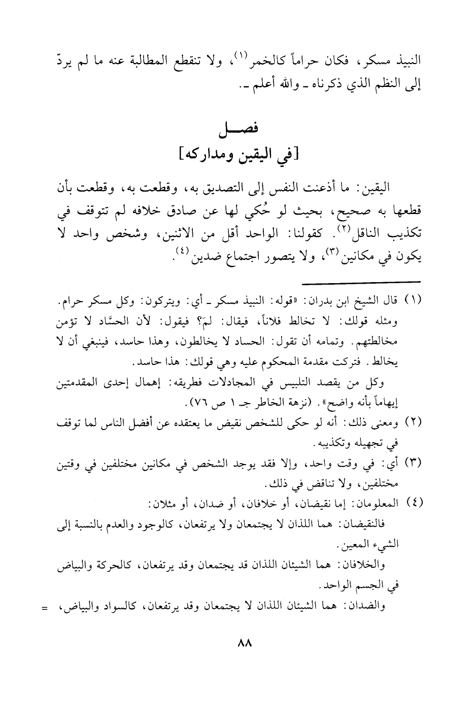 1 قال الشيخ ابن بدران: "قوله: النبيذ مسكر، أي: ويتركون: وكل مسكر حرام. ومثله قولك: لا تخالط فلانًا، فيقال: لِمَ؟ فيقول: لأن الحسَّاد لا تؤمن مخالطتهم. وتمامه أن تقول: الحساد لا يخالطون، وهذا حاسد، فينبغي أن لا يخالط. فتركت مقدمة المحكوم عليه وهي قولك: هذا حاسد.