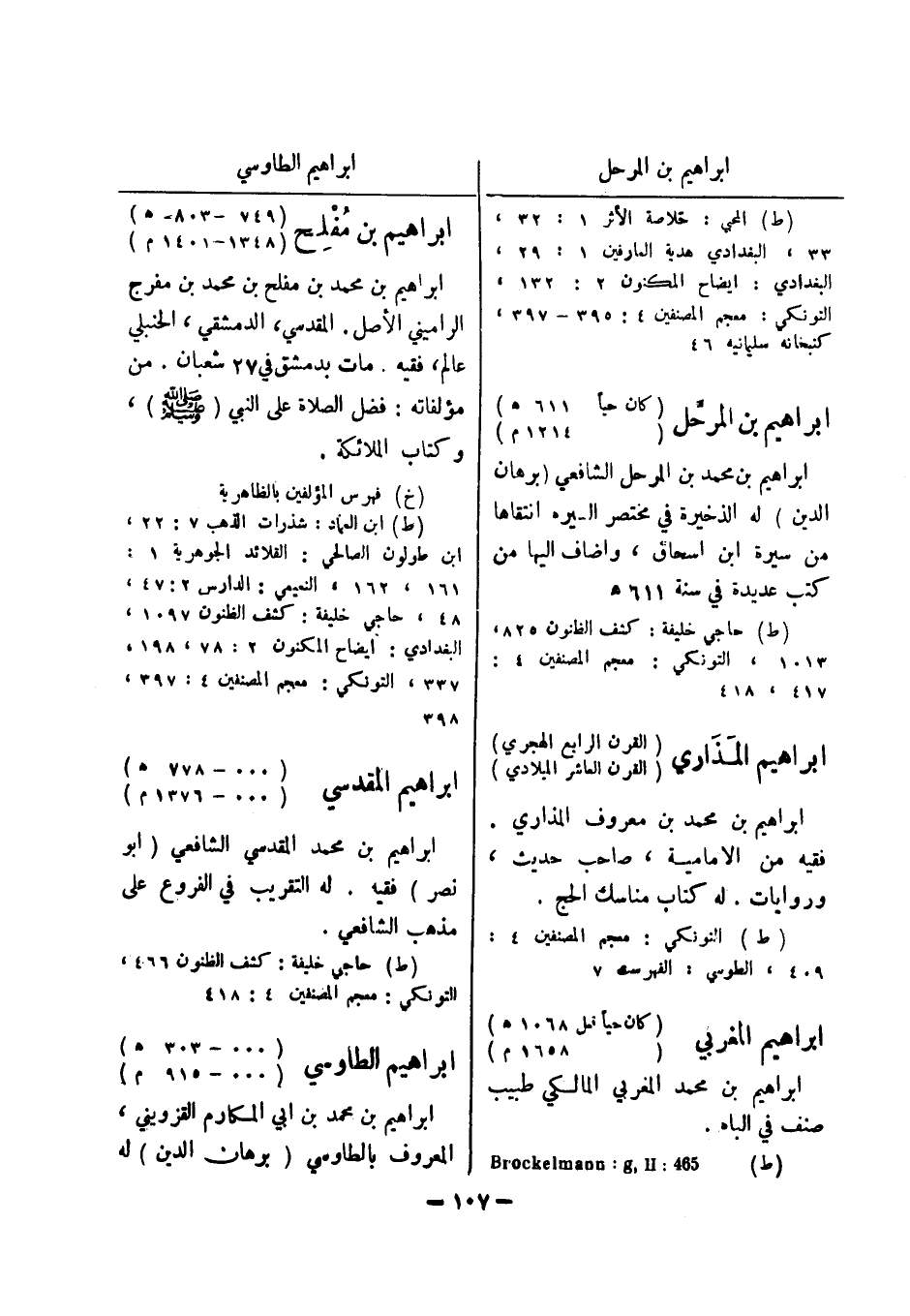 (ط) 465: Brockelmann: g , II ابراهيم بن مفلح (749 - 803 هـ) (1348 - 1401 م) ابراهيم بن محمد بن مفلح بن محمد بن مفرج الراميني الاصل.